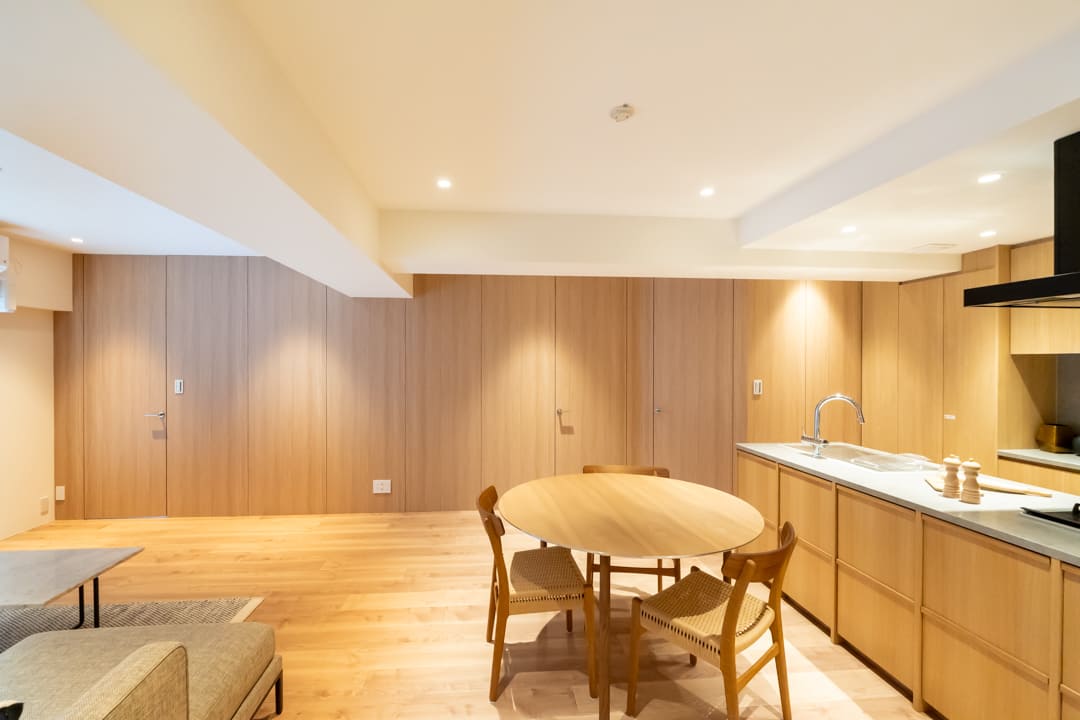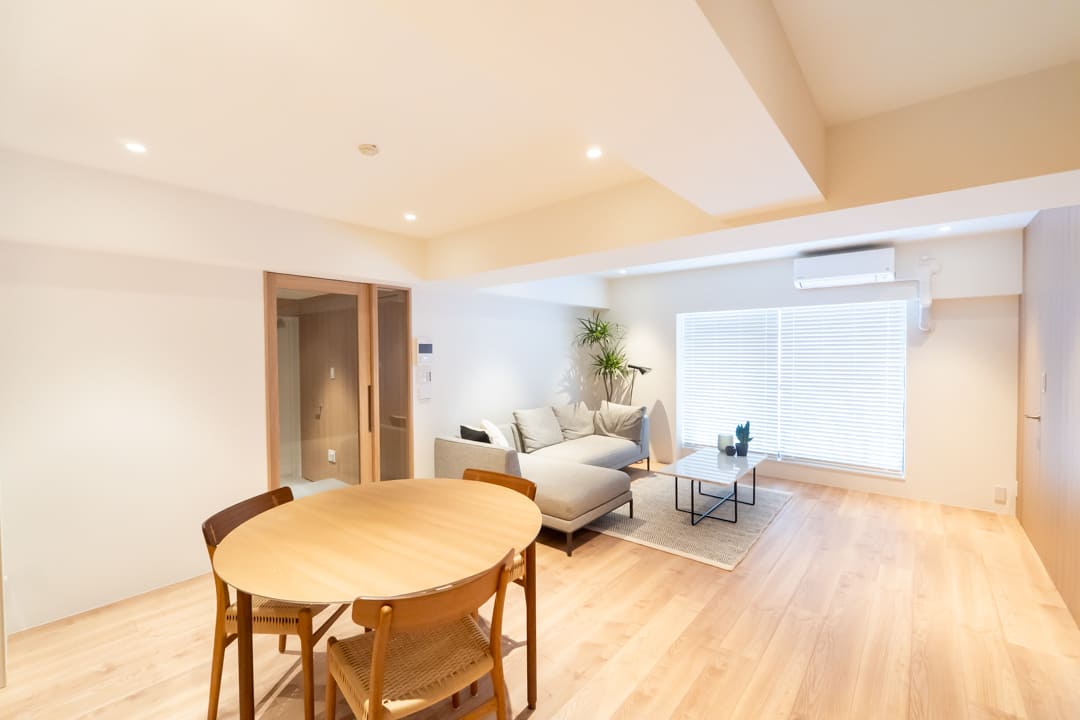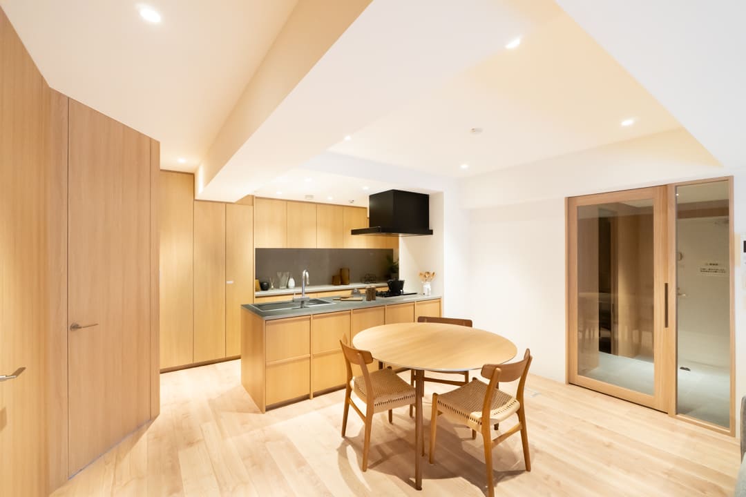 約20.5帖の広々としたリビングダイニングキッチンです。壁面には木目柄があしらわれていてナチュラルな雰囲気。ユナイテッドアローズ社が監修しているリノベーションで洗練された空間となっています。