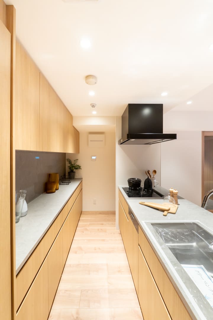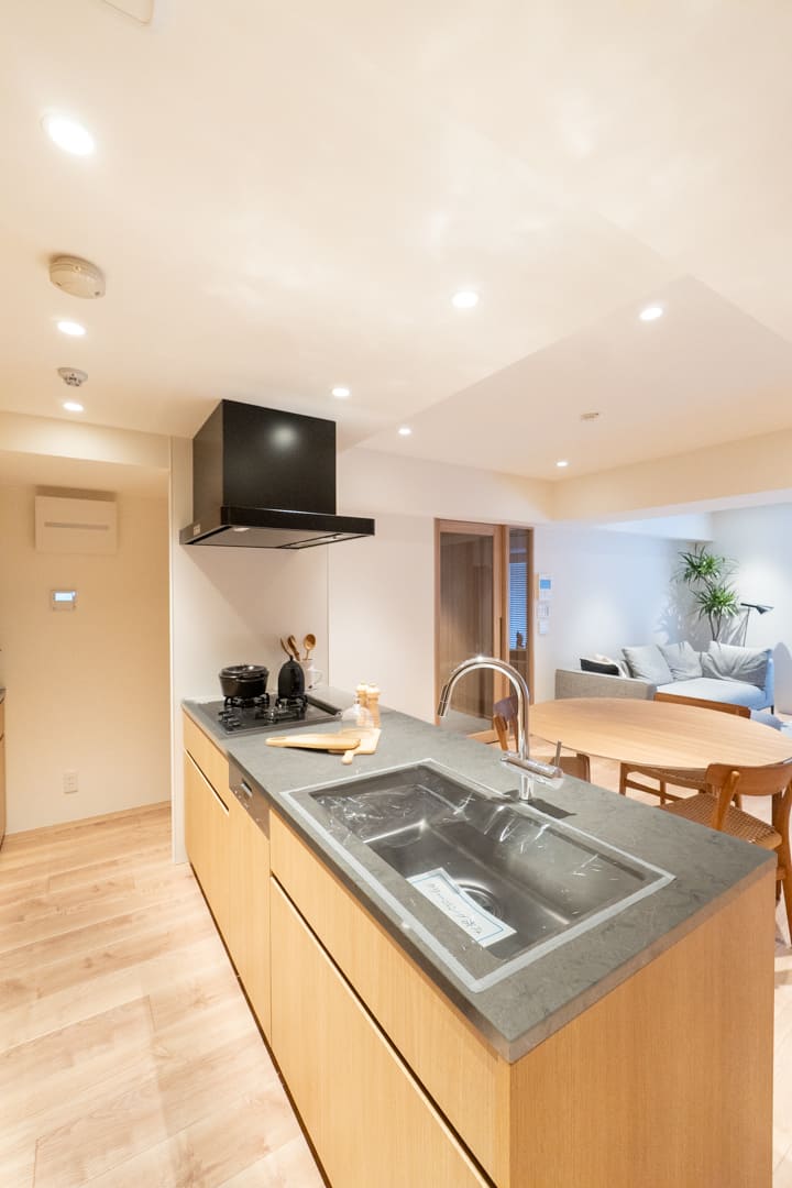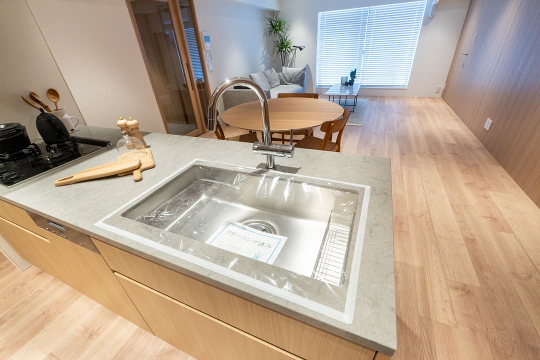 キッチンは、リビングダイニングを見渡しながら料理ができる対面式です。家族や来客とのコミュニケーションが取りやすくて◎。