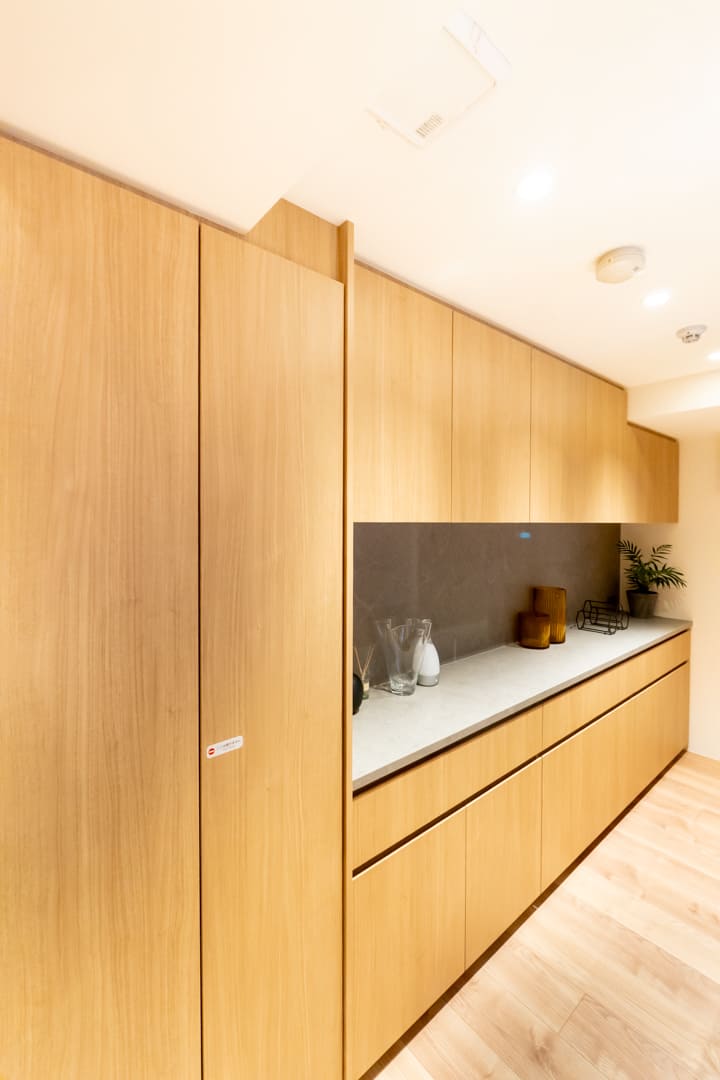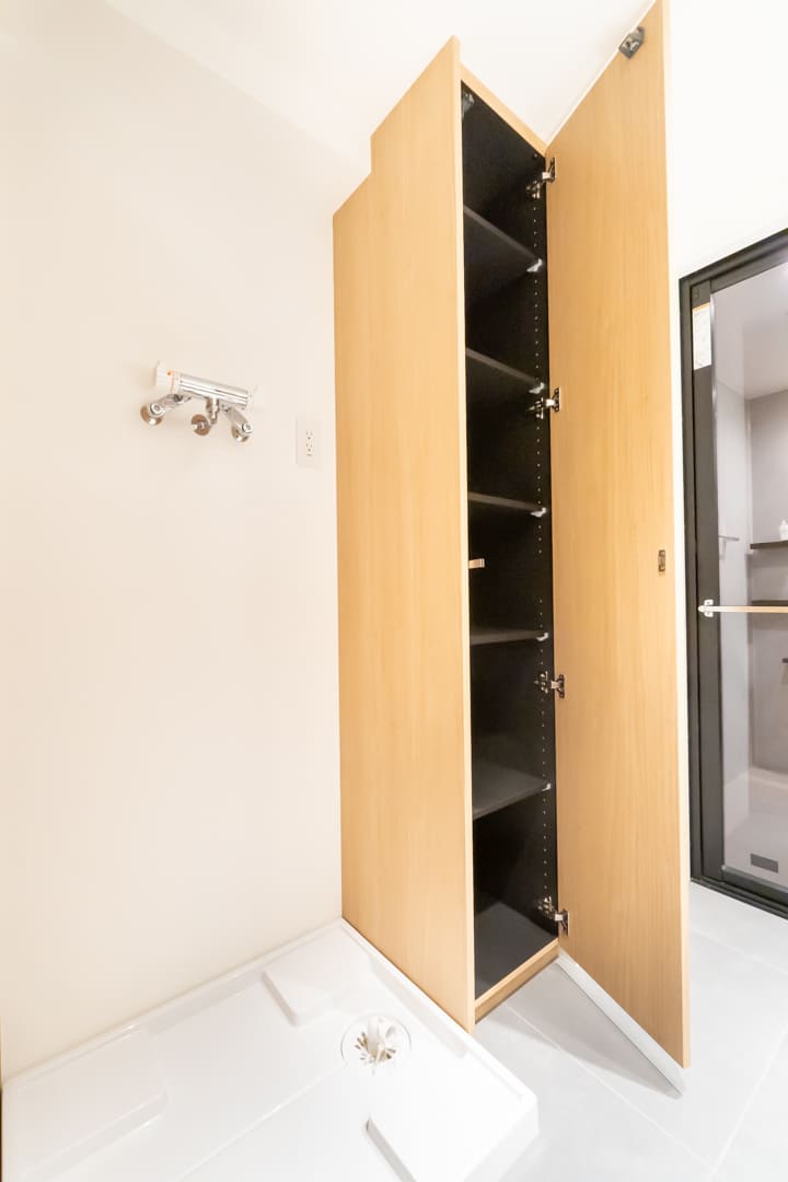 キッチンの背面側にはカップボードが備え付けられています。調味料や食器などを収納できるだけでなく、電子レンジなどを置くこともできるので便利です。