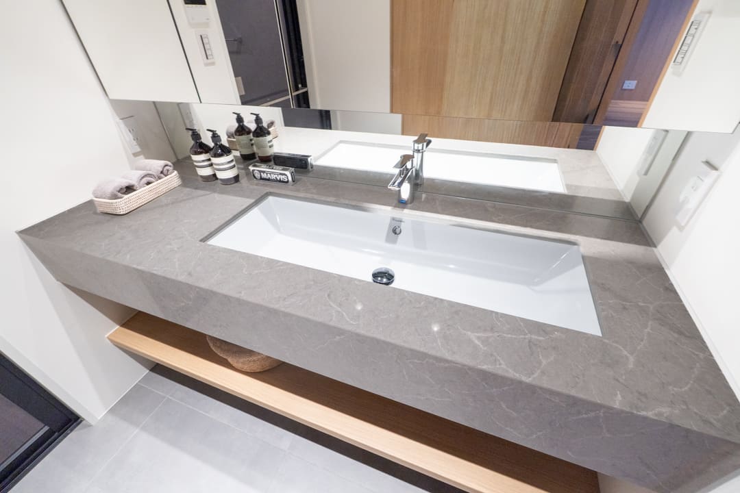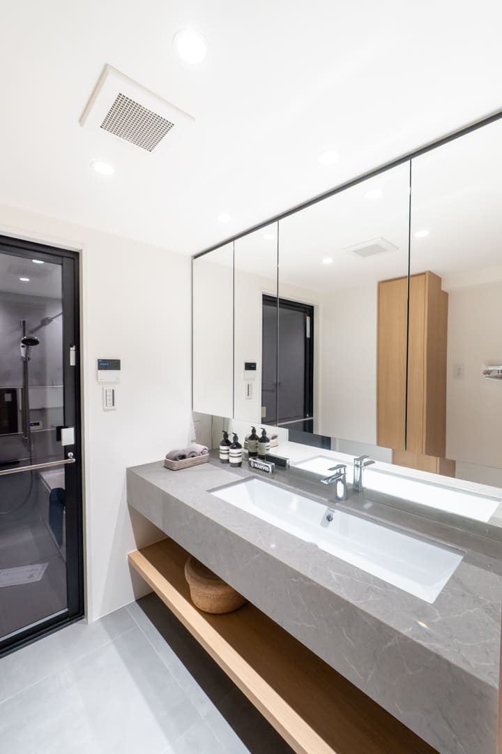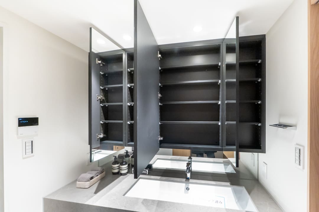 広めのカウンターで身支度がしやすくなっている洗面化粧台です。大きなミラーボックスの中には、化粧品などを収納できて使い勝手良好。また、背面側にはリネン類が造られているので、ごちゃごちゃしがちな洗面まわりもきちんと整頓させることができます。