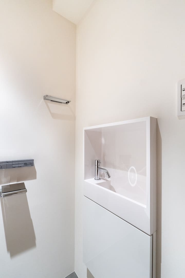 LIXIL製のウォシュレット一体型のトイレです。タンクレスタイプなのですっきりとした印象に。また、別途で手洗い器が造られているので、すぐに手を洗うことができて衛生的です。