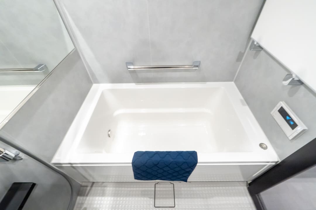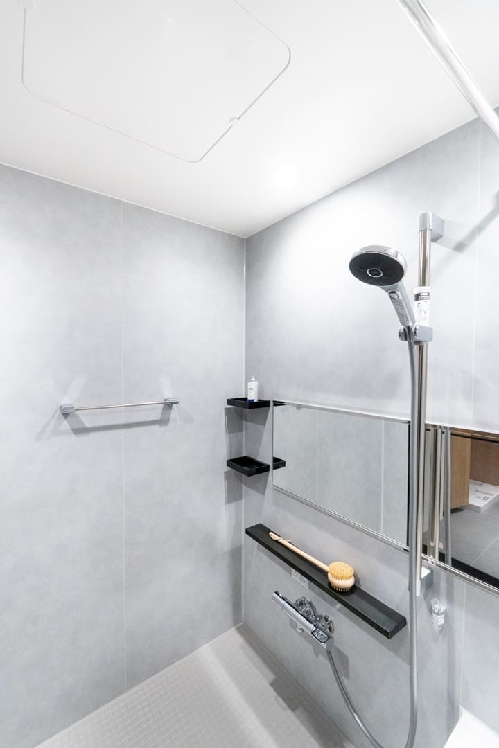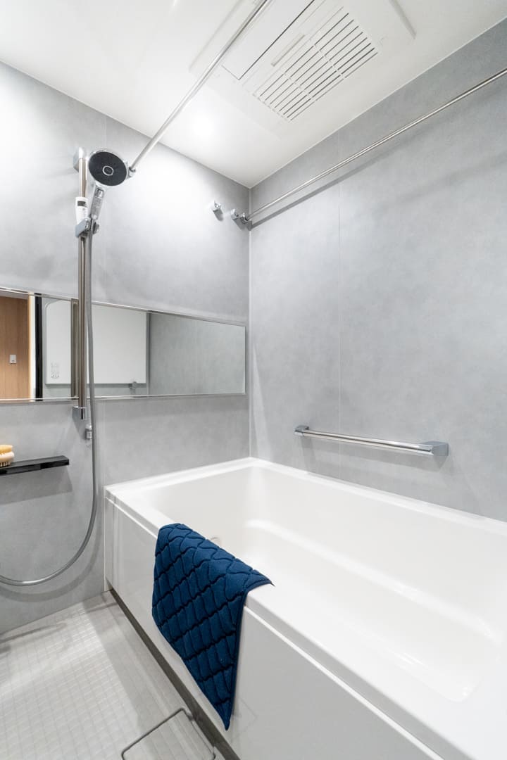 グレートーンでスタイリッシュな雰囲気のLIXIL製のバスルームです。お風呂にゆっくり浸かるのが好きという方に嬉しい追い焚き機能を搭載。家族の入浴時間がずれてしまっても安心です。また、浴室乾燥機には暖房・乾燥・換気・涼風の機能がついており、一年中快適に過ごすことができます。