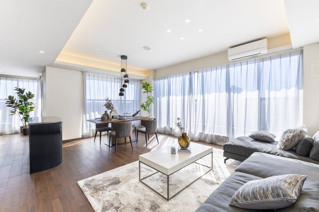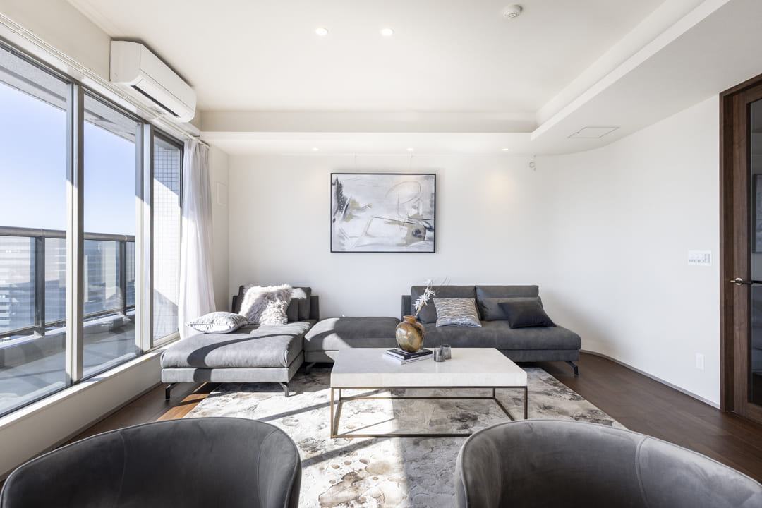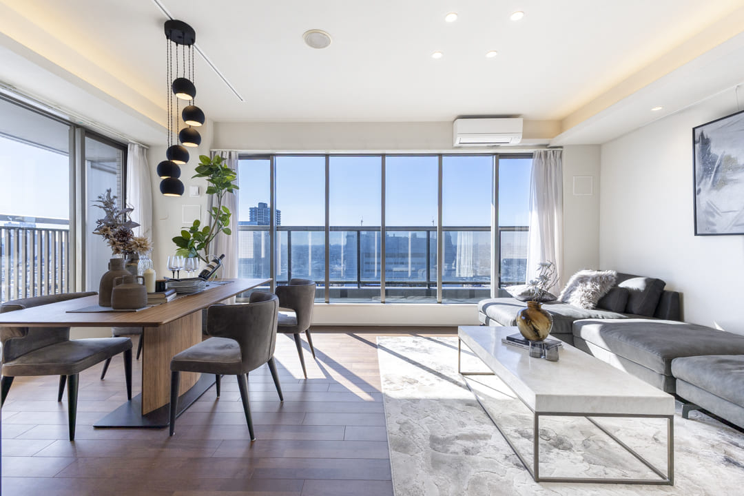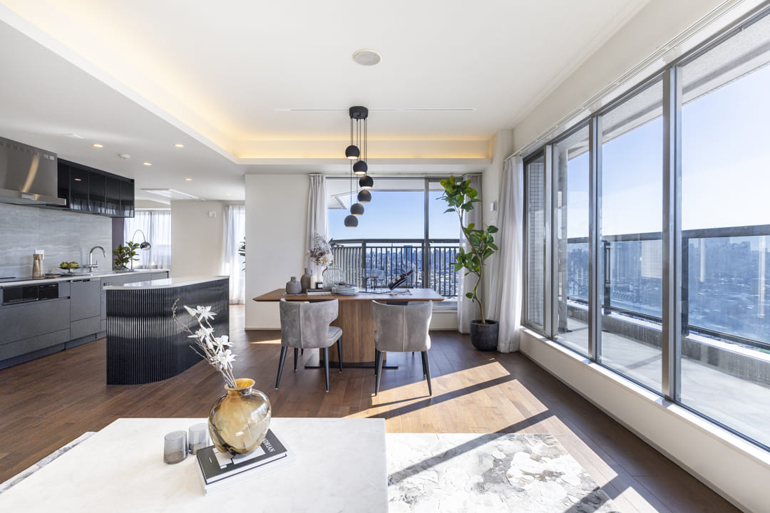 キッチンを含めて約32.7帖を確保した、ゆとりあるリビングダイニング。南東2面採光により、日当たり・風通しともに良好です。南向きのワイドサッシからはたっぷりの陽光が差し込み、ガラスパネルのバルコニーと相まって、空や景色との一体感を感じられる開放的な空間が広がります。眺望を楽しみながら、ゆったりとくつろぎの時間をお過ごしいただける、心地よいリビングです。