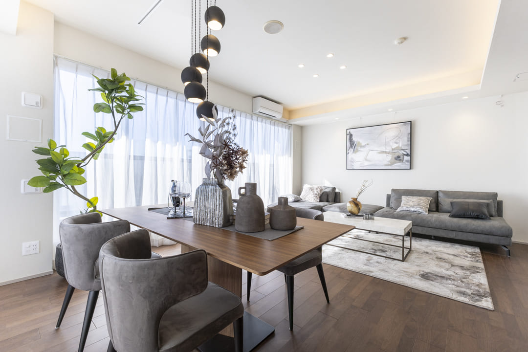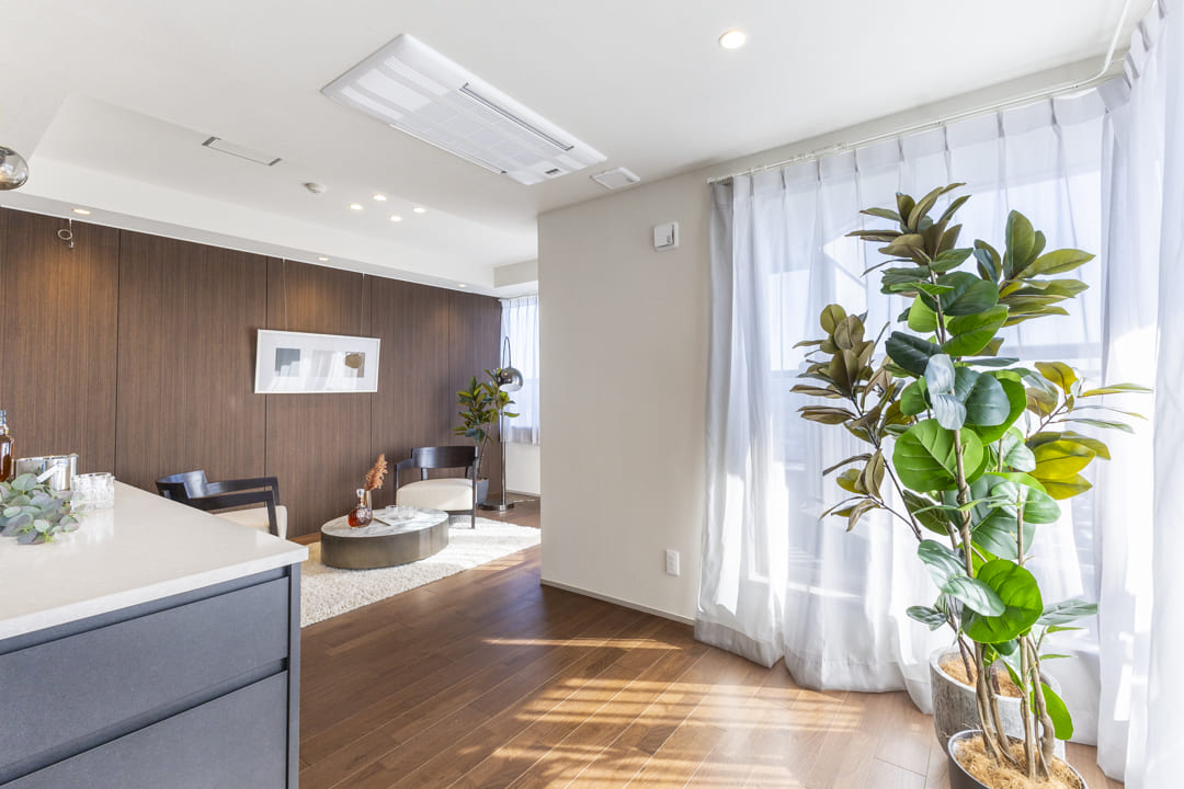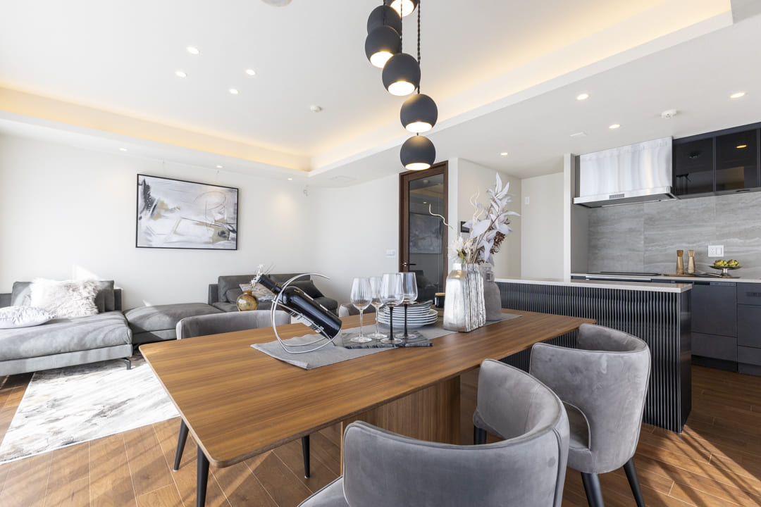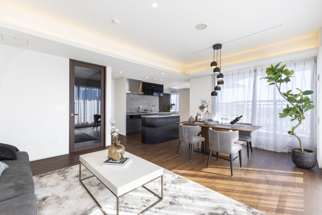 ホワイトを基調とした内装に、ダークカラーのキッチンをアクセントとして効かせたシックモダンなデザイン。深みのある木目フローリングが空間に温もりと上質感を添え、落ち着きのある雰囲気を演出します。折り上げ天井には間接照明を施し、やわらかな光がリラックス感を高めてくれます。