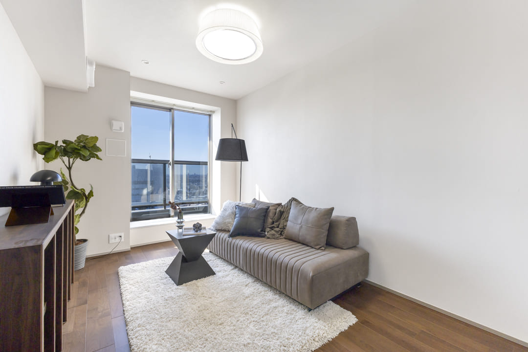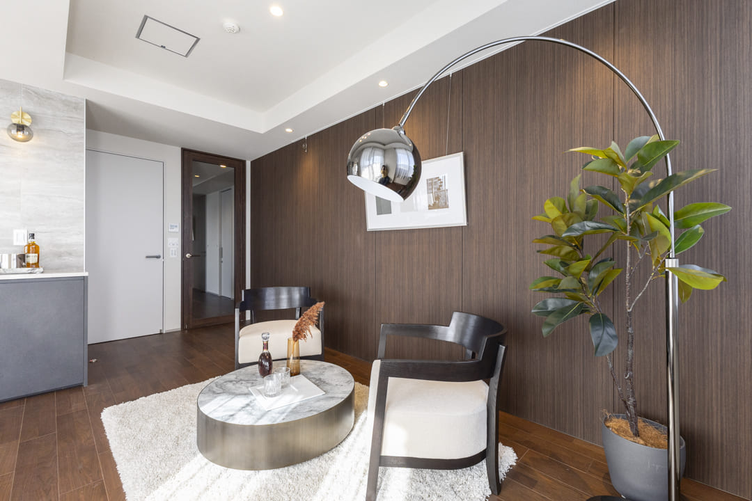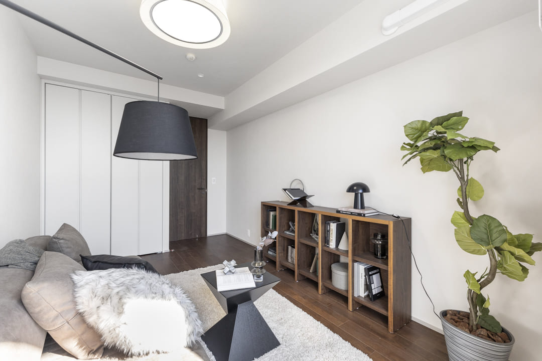 キッチン奥には、木目調のアクセントウォールが印象的なリラックススペースを配置。ピクチャーレールを活用してアートや植物を飾るなど、心地よい空間づくりを楽しめます。南東2面の窓から明るい光が届き、読書や穏やかなティータイムにも最適。こちらにも床暖房を備え、季節を問わず快適にお過ごしいただけます。