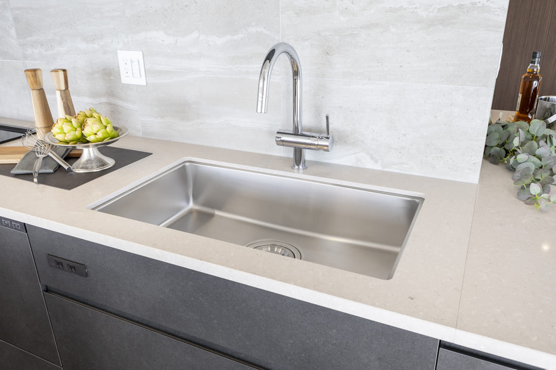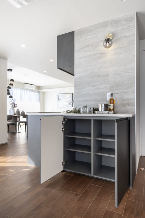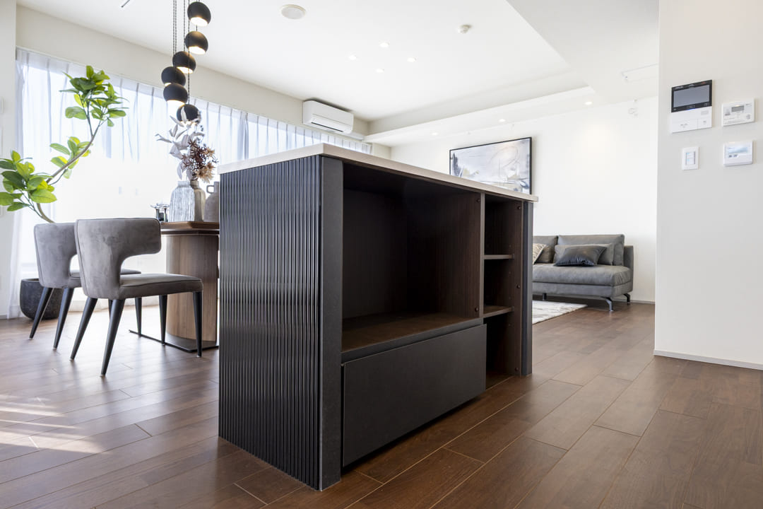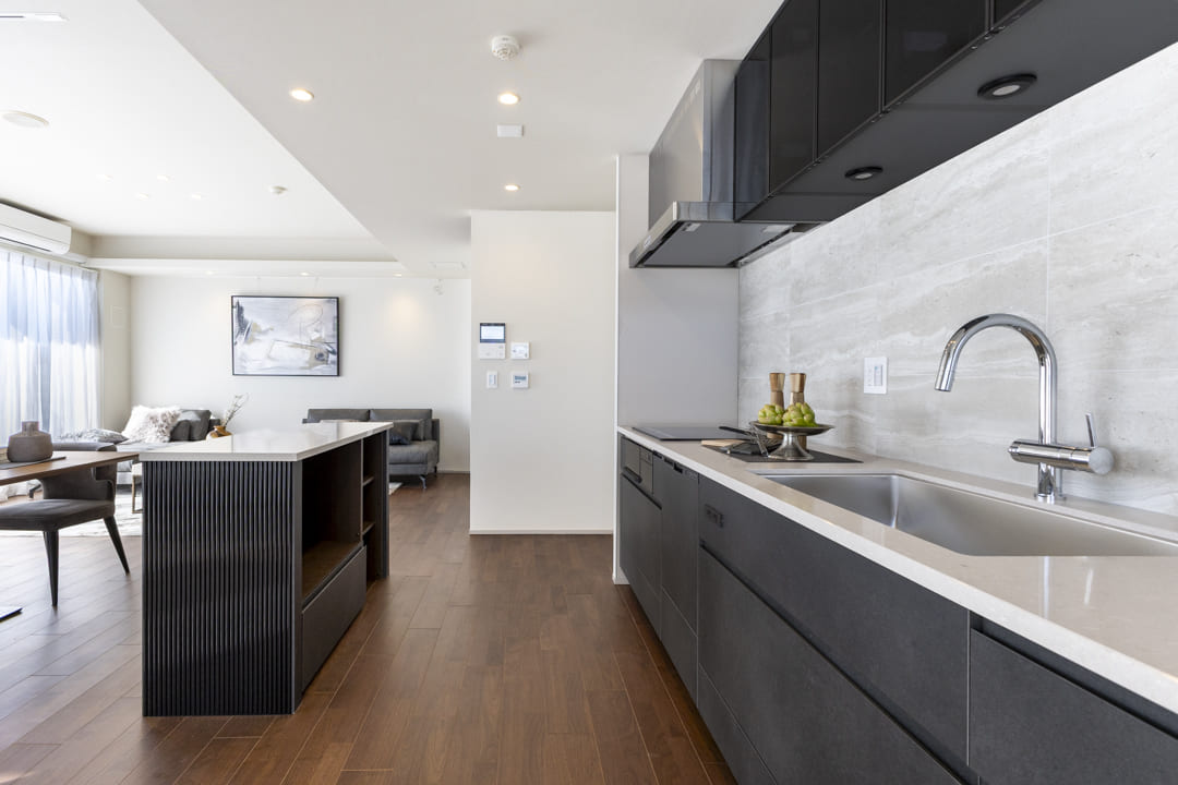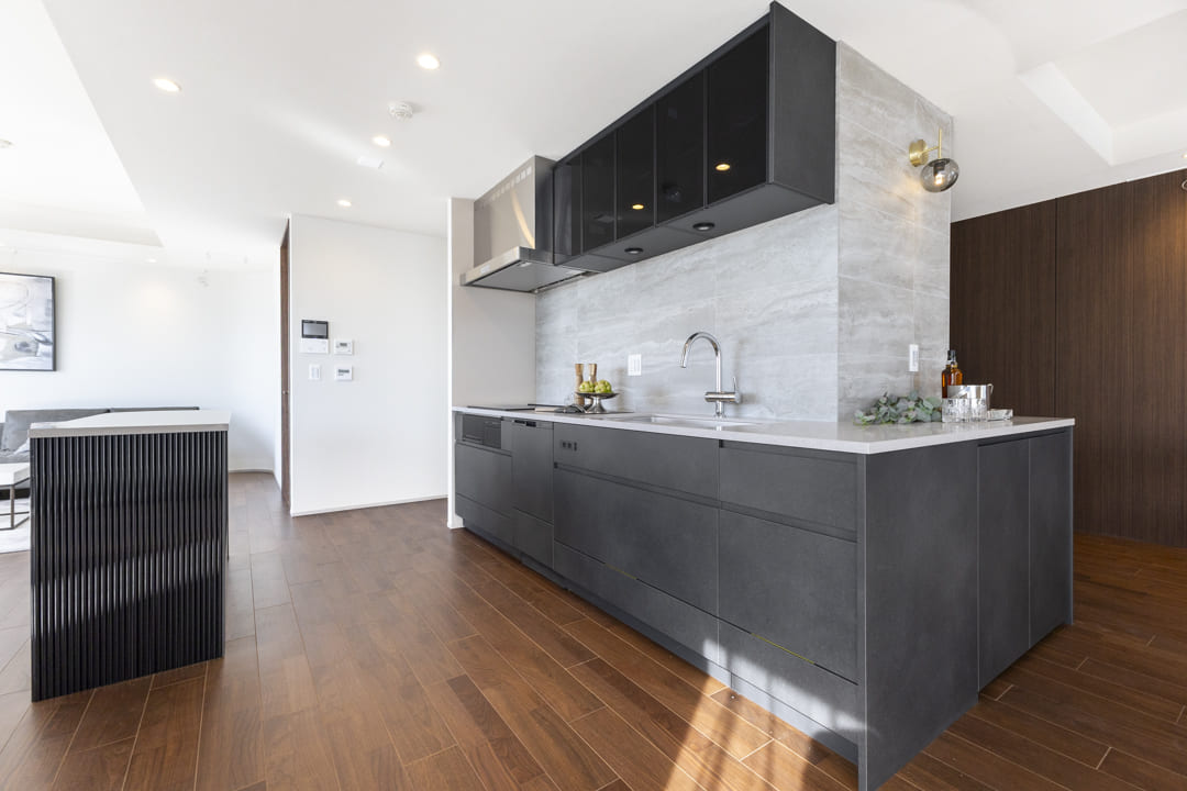 ダークトーンの面材と石調カウンターが美しく調和する、シックで洗練されたキッチン。壁付けタイプのため動線がコンパクトにまとまり、調理に集中しやすいレイアウトです。収納スペースも豊富で、調理器具や食器類をすっきりと収めることができます。背面にはカウンター収納を備え、作業スペースや家電置き場としても活躍。複数人での調理や配膳にも対応でき、日々の家事を効率よくサポートしてくれる実用性の高いキッチン空間です。