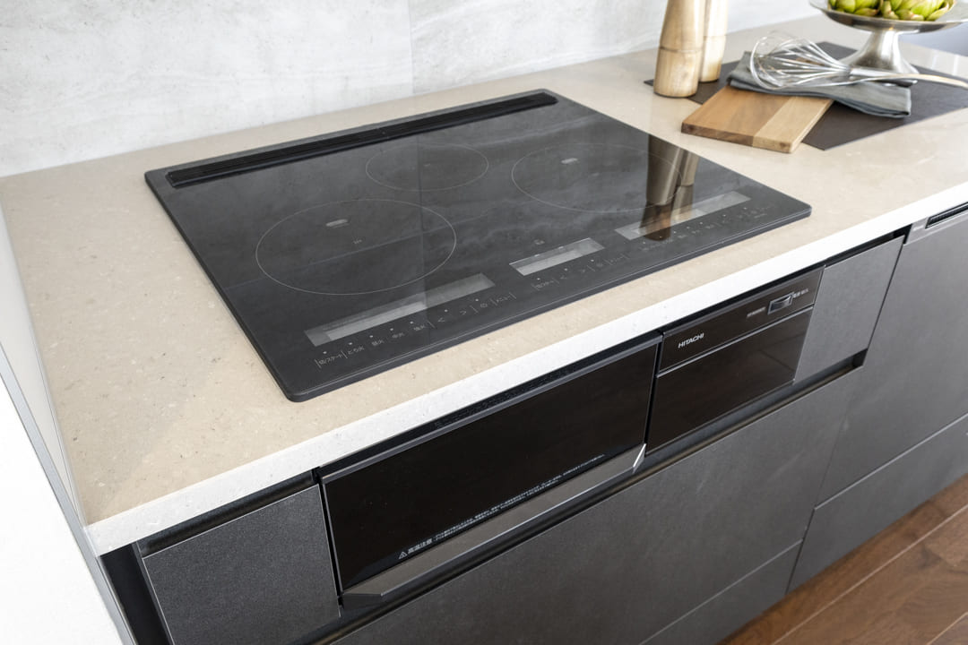 3口IHクッキングヒーター、浄水器一体型水栓、フロントオープンの食洗機を完備。IHはスイッチ操作で火力調整がしやすく、ガスコンロに比べて扱いやすいのも魅力です。凹凸のないフラットな天板はお手入れが簡単で、清潔感のある状態を保ちやすく、日々の調理や後片付けをスマートにサポートします。