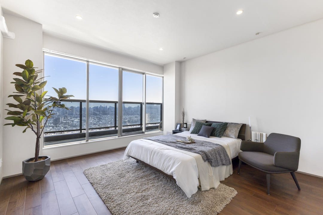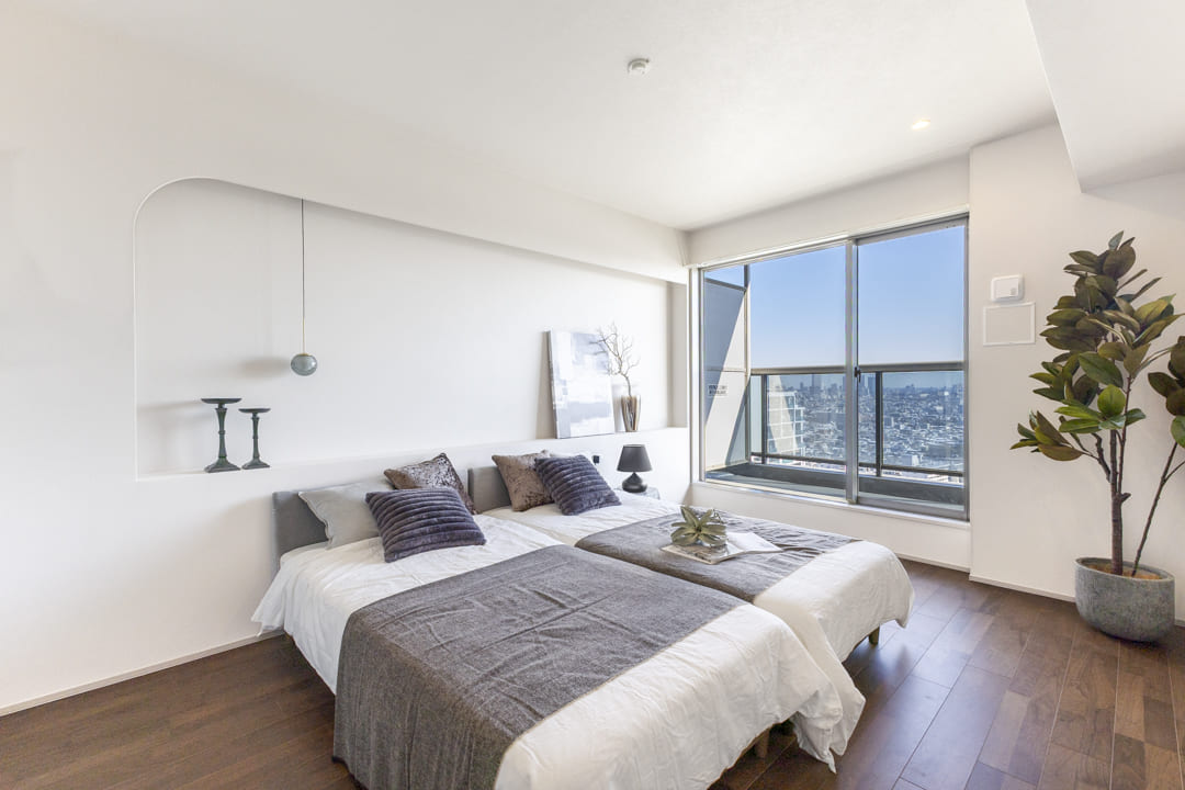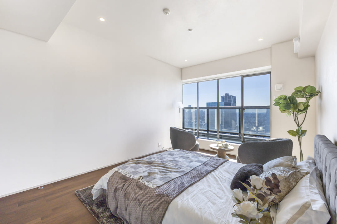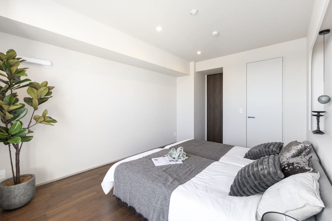 約10.7帖の洋室1。東向きの大きな窓からやわらかな朝日が差し込み、爽やかな一日の始まりを演出します。ダブルベッドはもちろん、シングルベッド2台を配置してもゆとりのある広さで、主寝室として快適にお使いいただけます。WIC(ウォークインクローゼット)付きで、衣類や季節物もすっきりと整理可能。機能性と居住性を兼ね備えた一室です。