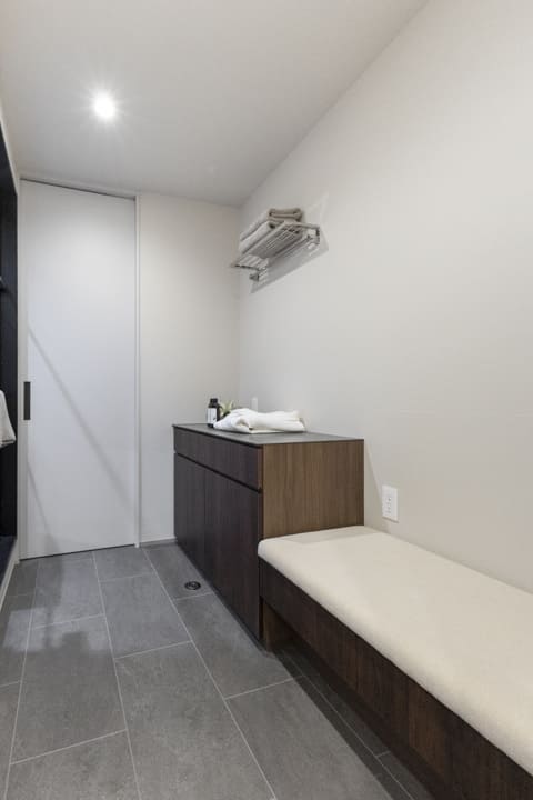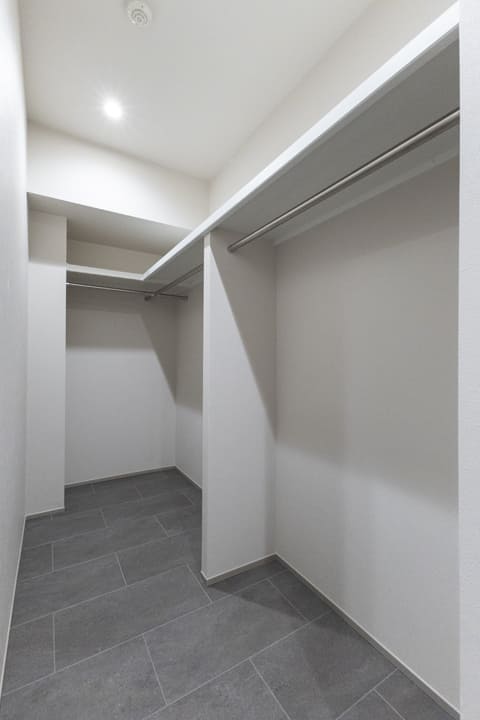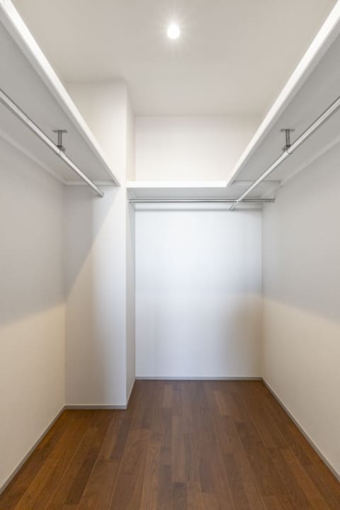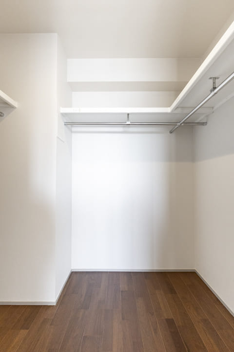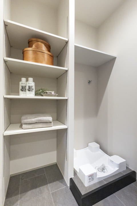 脱衣スペースの奥には、独立したランドリールームを完備。洗濯機パン、可動棚、ハンガーパイプを備え、洗濯から乾燥・収納までをスムーズに行える家事動線が魅力です。洗濯乾燥後の衣類をそのまま掛けて保管でき、日々の家事負担を軽減します。扉でしっかり仕切られているため、来客時には生活感を抑えられるほか、洗濯機の運転音が居室に伝わりにくい点も嬉しいポイントです。