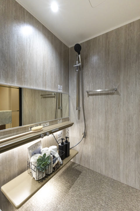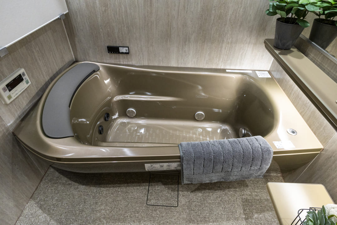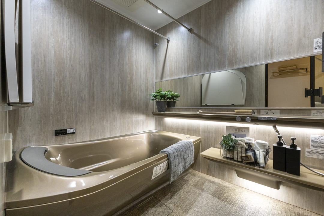 1620サイズのバスルームは、ゆったりと寛げる上質な空間。ブラウンゴールドの浴槽がラグジュアリーな雰囲気を演出します。ヘッドレスト下部と腰位置からお湯が流れる「楽湯」機能を搭載し、全身を包み込むように温めてくれます。流量は好みに応じて調整可能。浴室換気乾燥暖房機・追い焚き機能も備え、快適なバスタイムを支えます。