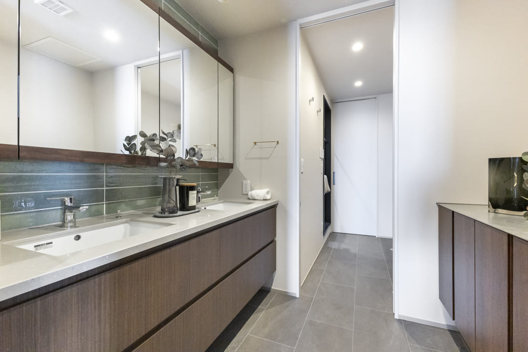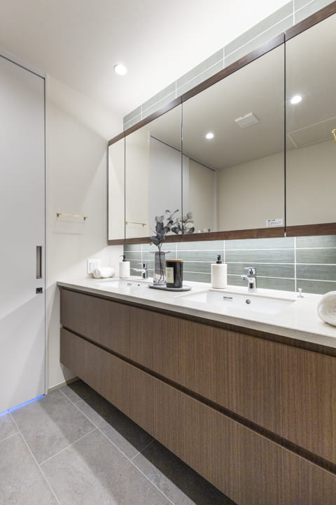 木目デザインが洗練された印象をもたらす洗面化粧台は、ゆとりある2ボウル仕様。2人並んで使用でき、忙しい朝の身支度にも余裕が生まれます。ミラーボックスや足元の引き出しに加え、背面にはカウンター収納を完備。高い収納力で、すっきりと清潔感のある空間を保てます。