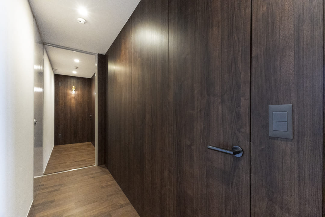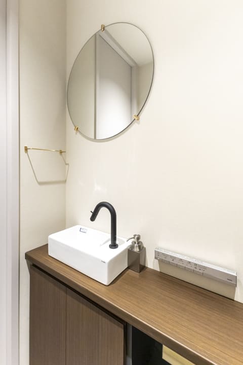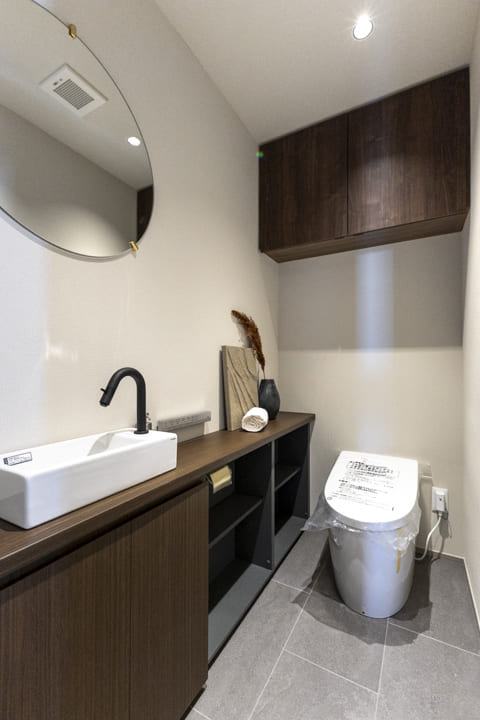 レストルームは2ヶ所に設けられ、シーンに応じた使い分けが可能です。廊下の奥に配置されたトイレは、ご家族のプライベート利用に適した落ち着きのある空間。もう一方は玄関近くに位置し、独立性が高く、ゲスト用としてもスマートにお使いいただけます。いずれもTOTO製の洗浄機能付きタンクレストイレを採用し、すっきりと洗練された印象に。手洗いカウンターも備え、機能性とデザイン性を兼ね備えた、上質な空間に仕上がっています。