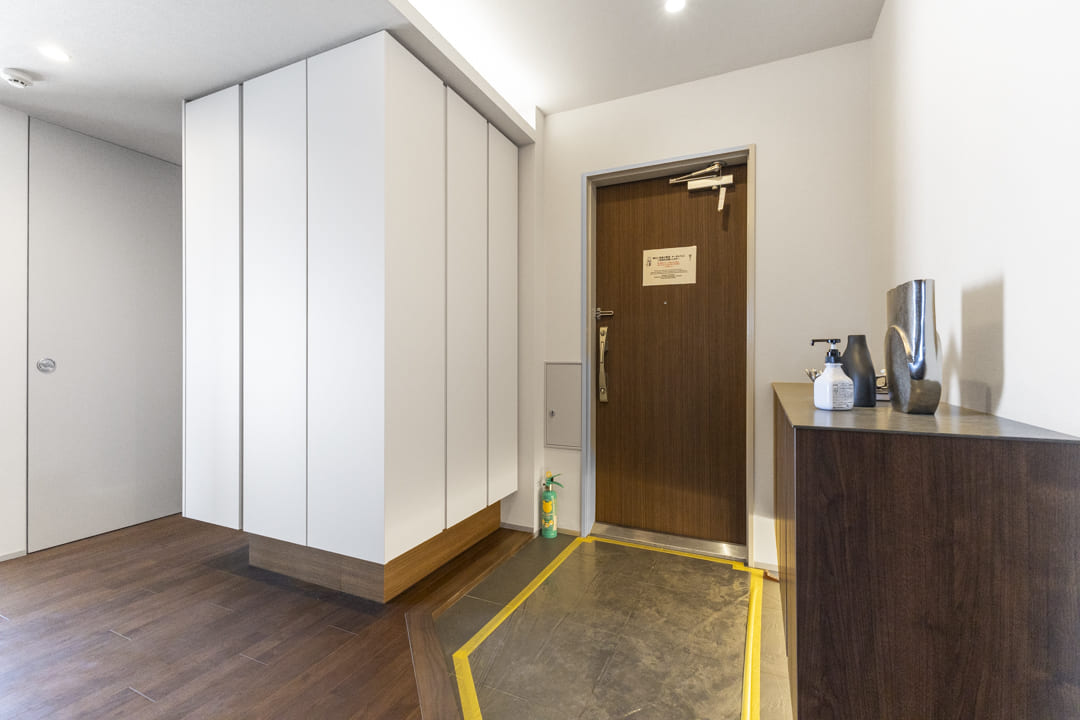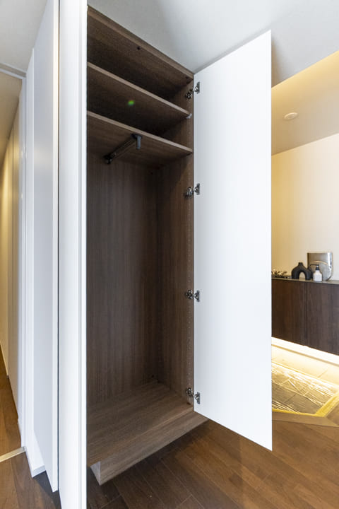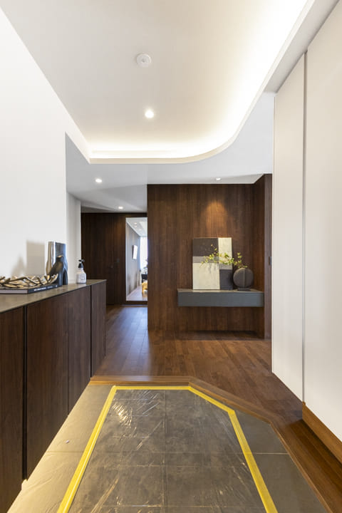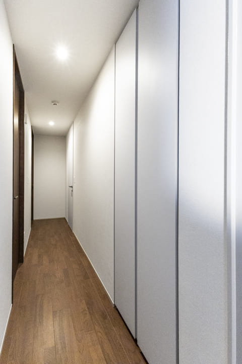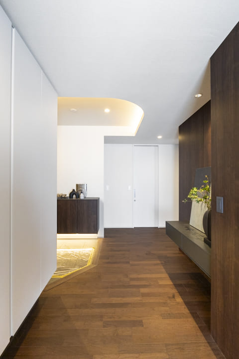 アールを描く下がり天井に間接照明を配した、落ち着きと品格を感じる玄関ホール。やわらかな光が空間を包み込み、住まいの第一印象を美しく演出します。左右にシューズボックスを備え、収納力も充実。靴はもちろん、外出小物やケア用品もすっきりと収まります。カウンターにはフラワーベースやアート、小物を飾ることで、季節感や個性を取り入れた空間づくりを楽しめます。また、廊下には納戸と物入を配置し、日用品やストック類の収納に便利。住空間をすっきりと保ちやすく、機能性にも配慮された設計です。