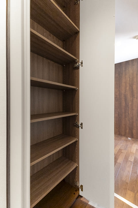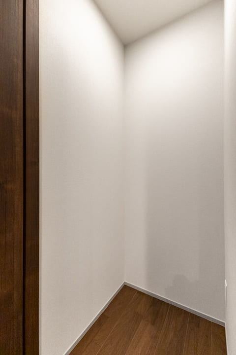 キッチン奥には、大容量のパントリーを設置。自由度の高い可動棚により、食料品や日用品のストック、キッチン家電まで効率よく収納できます。廊下側からも出入り可能な動線設計で、買い物後は冷蔵庫までスムーズにアクセスでき、家事効率の向上にも寄与します。