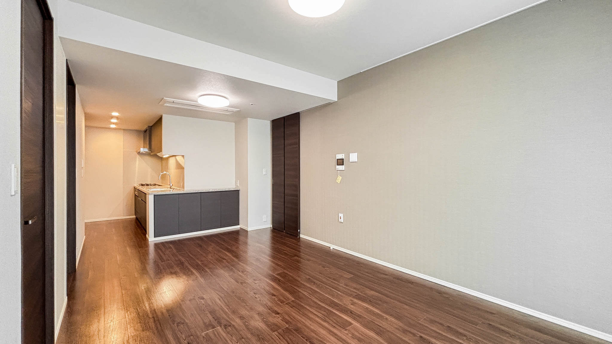 約11.5帖のリビングダイニング。窓が大きく開放的、朝から光が感じられる東向きです。リビングの一角には収納スペースを完備。生活雑貨の整頓に便利です。また、床暖房も設置されていて、冬場でも足元からじんわりと温まれます。