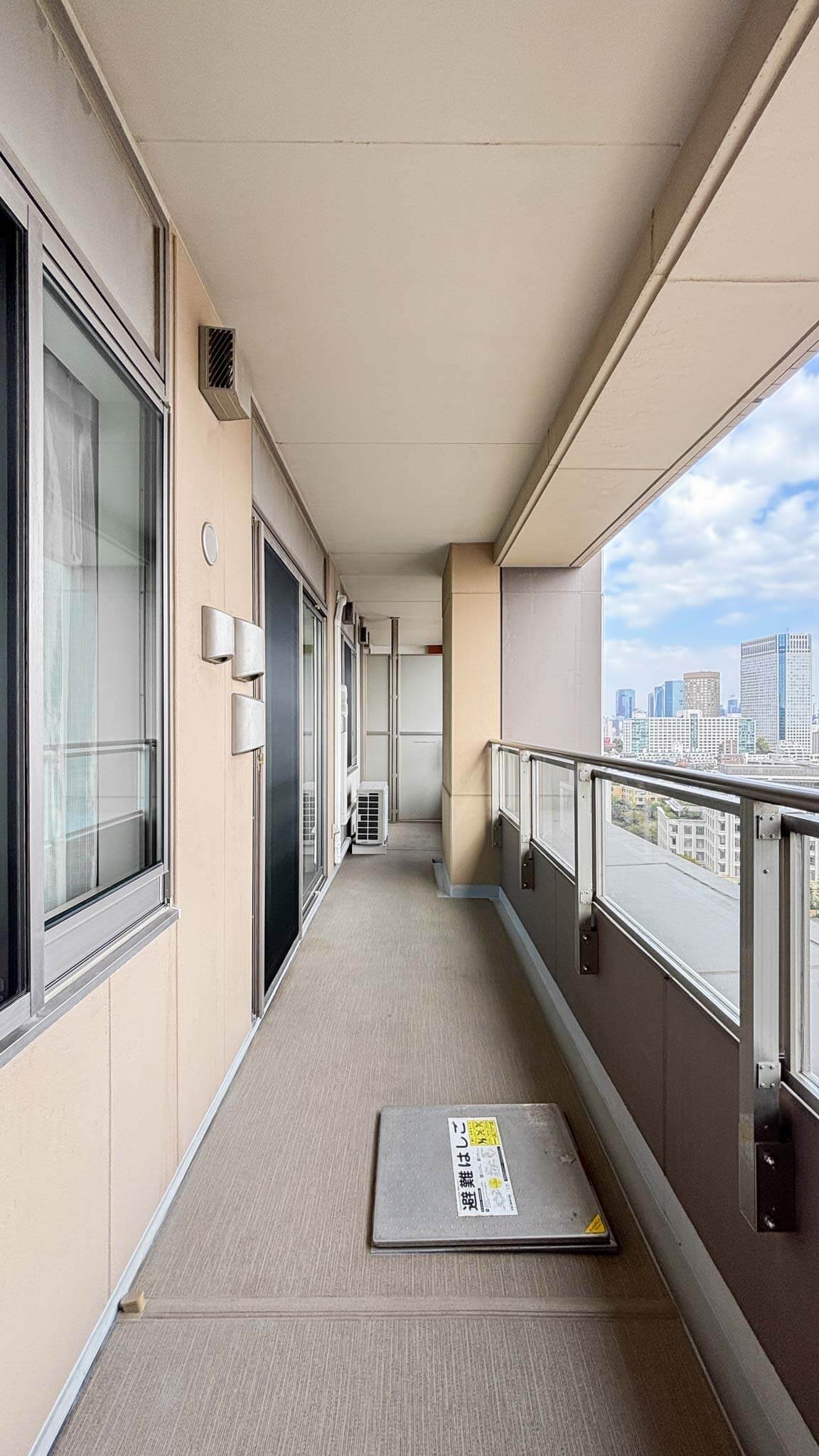 リビングダイニングと2つの洋室に面したバルコニー。約12.68㎡の広さで、手すりの上部が透明になっているので開放感も感じられます。17階部につき開放的な景色が望めます。