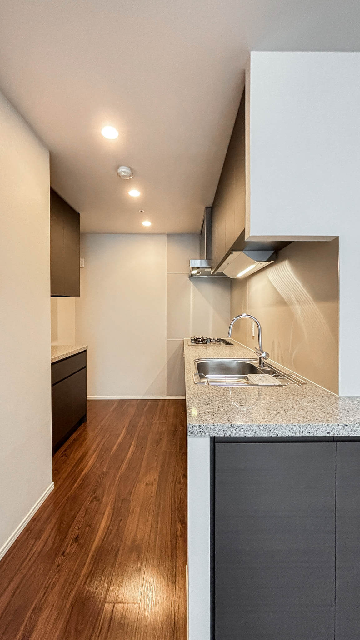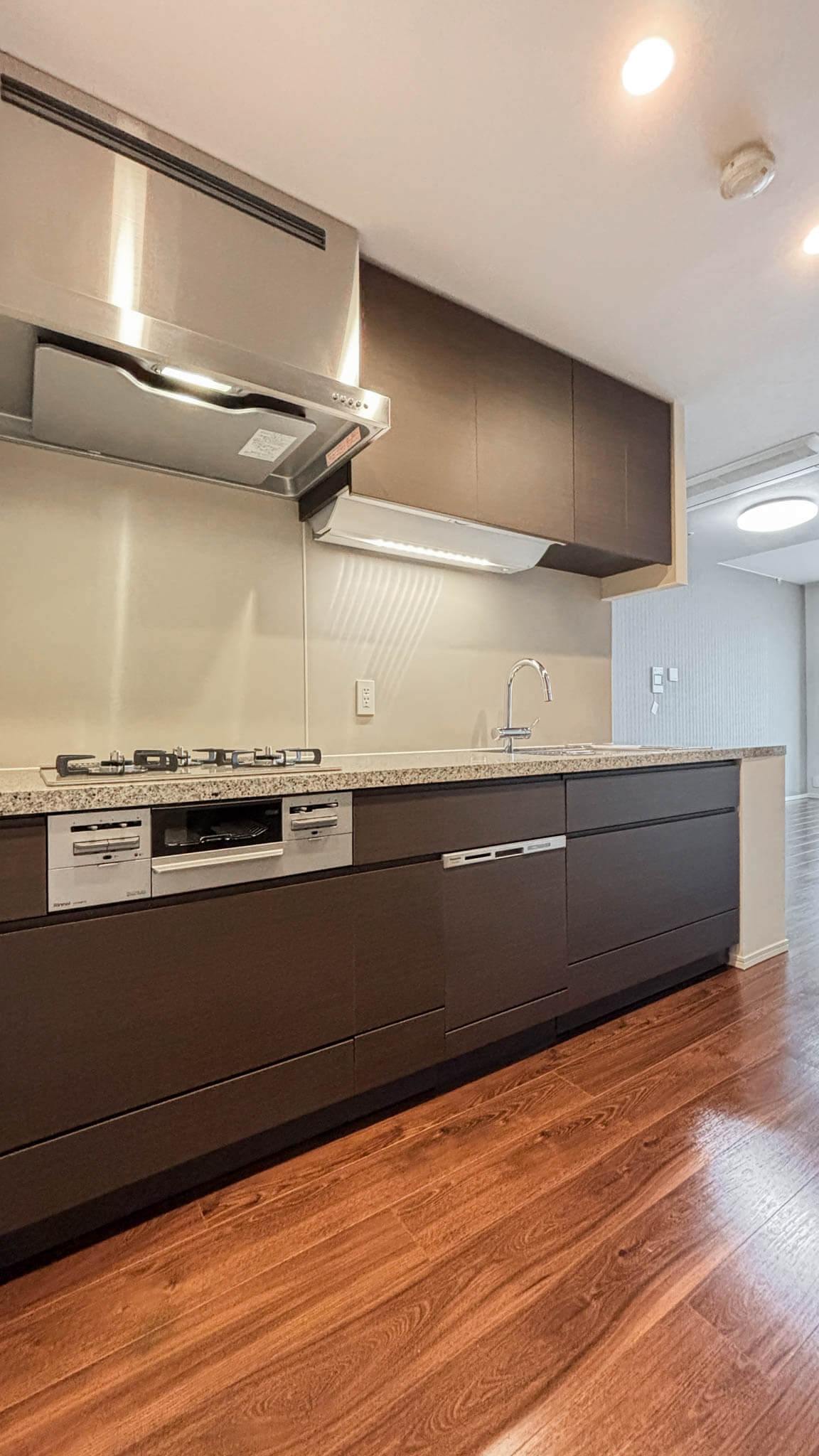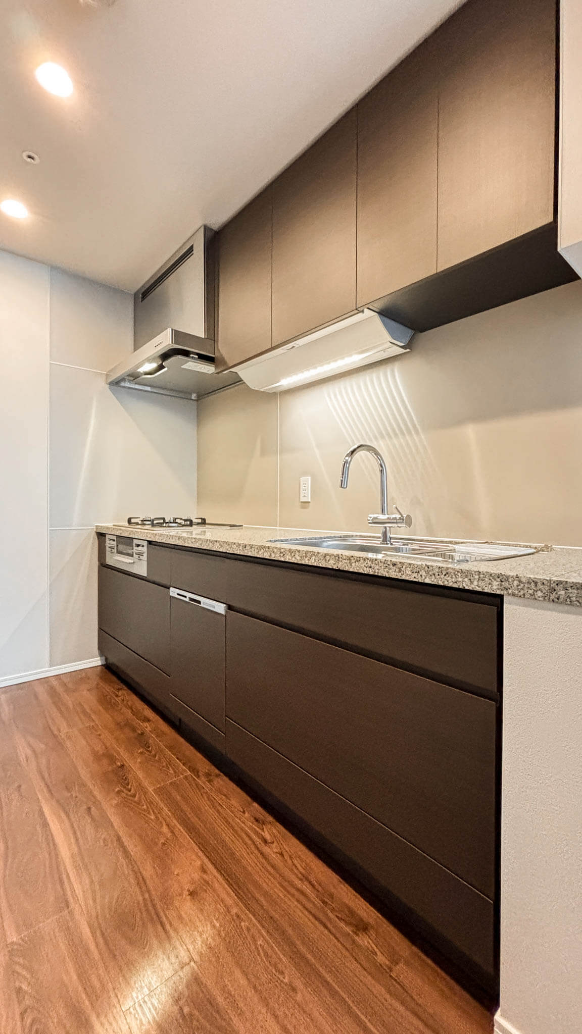 約3.2帖のキッチンスペース。リビングと空間分けされていて、キッチンまわりの生活感をさりげなく目隠しできます。料理が捗る3口ガスコンロ、家事の時短に心強い食洗機付き。カップボードも設置されていて、収納スペースもしっかりと確保されています。