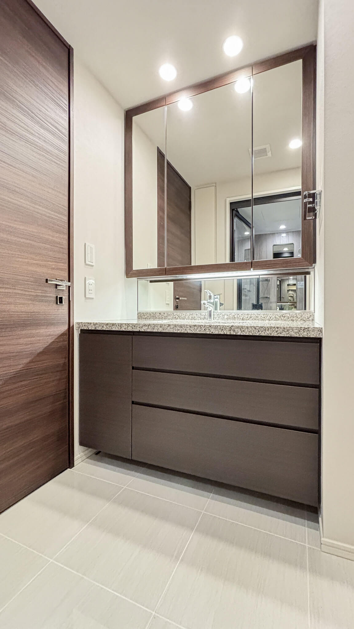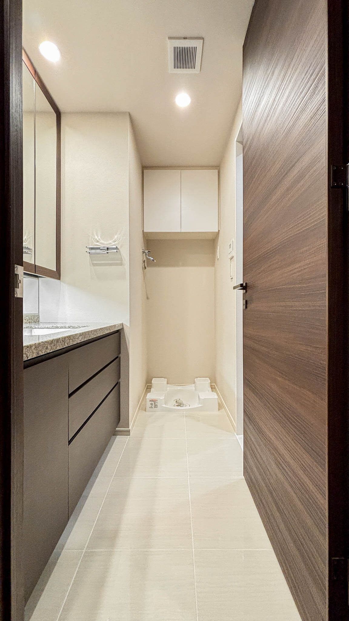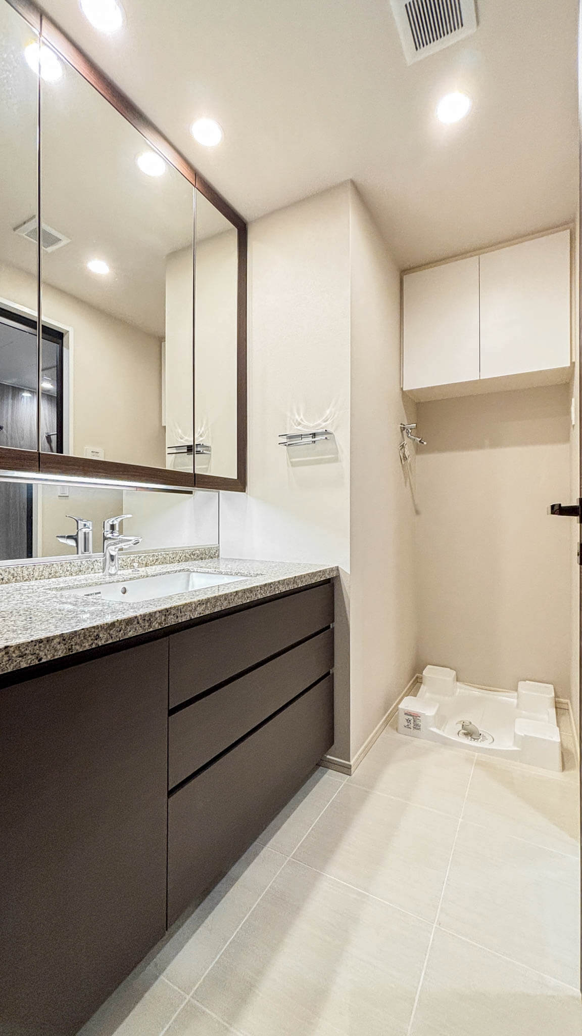 重厚感のあるホテルライクな雰囲気の洗面化粧台。洗面まわりの小物がすっきり整頓できるミラーボックス付き。別途リネン庫も設けられています。