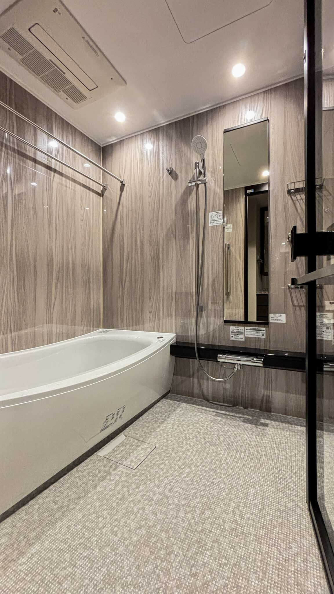 1418サイズのバスルーム。ウッド調であたたかみのある雰囲気です。追い炊き機能の他、浴室換気乾燥機とランドリーパイプ付きで、雨の日や冬場の洗濯にも困りません。