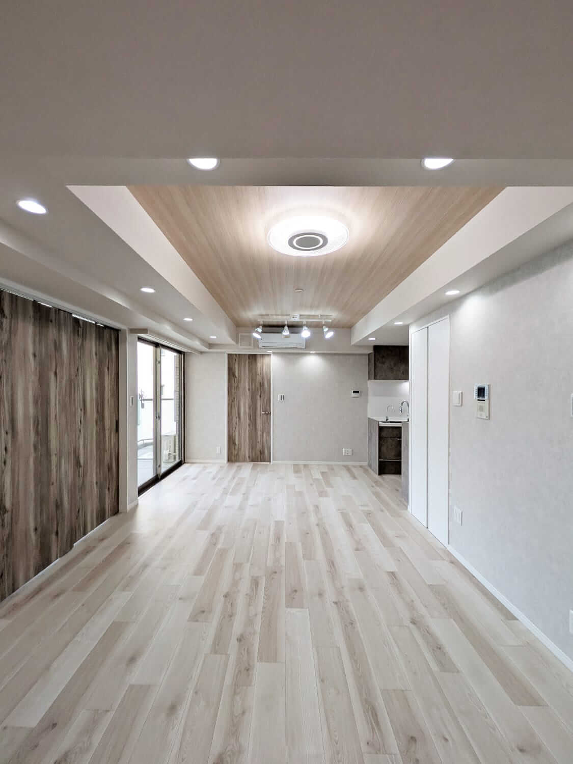 約12.9帖のリビングダイニング。大きな窓で開放感のある空間です。天井にもウッドが使用されていて、あたたかみのある雰囲気も感じられます。また、床暖房が設置されていて冬場でも足元からじんわりと温まれます。床に直接座ったり、寝転んでもひんやり感なく暖かく過ごせます。リビングの一角には物入も備わっていて、生活雑貨の整頓に便利です。