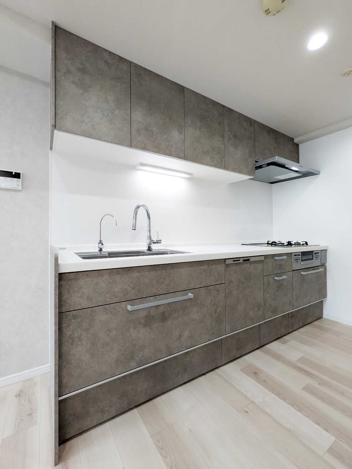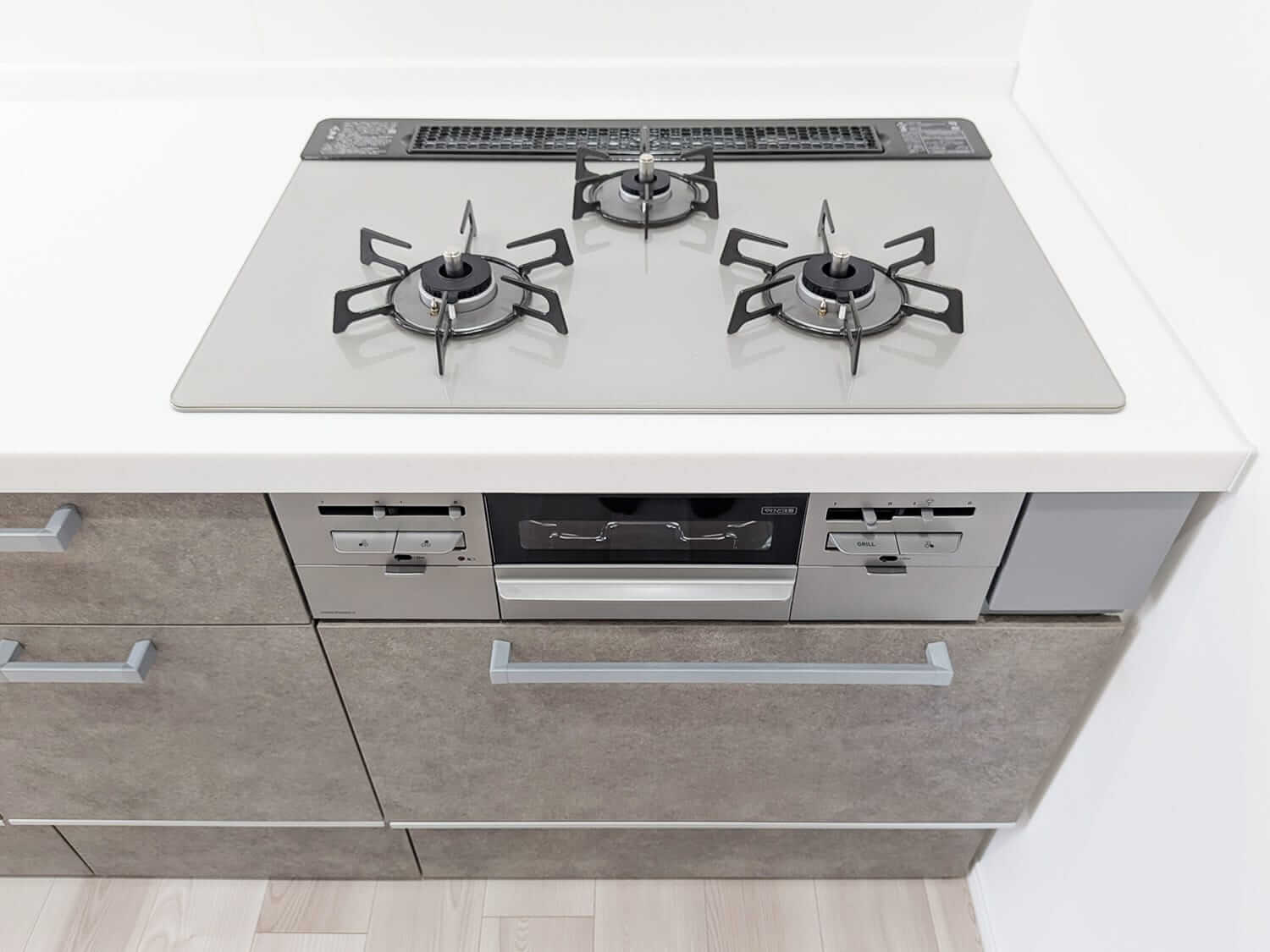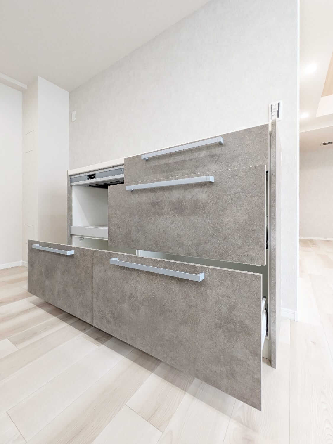 約4.1帖のキッチンスペース。リビングと空間分けされていて、キッチンまわりの生活感をさりげなく目隠しできます。料理が捗る3口ガスコンロ、家事の時短に心強い食洗機、料理にそのまま使える浄水器付きで設備が充実。カップボード付きで収納スペースもしっかりと確保されています。