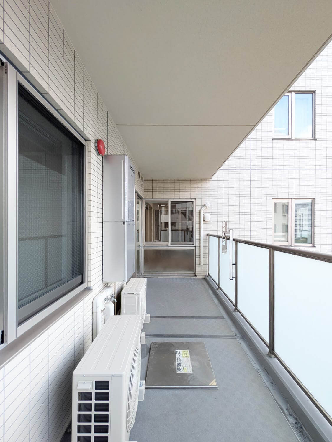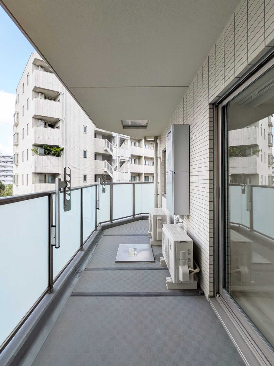 リビングダイニングと洋室に面したバルコニー。約10㎡ほどの広さ、南西向きで自然な光が感じられます。