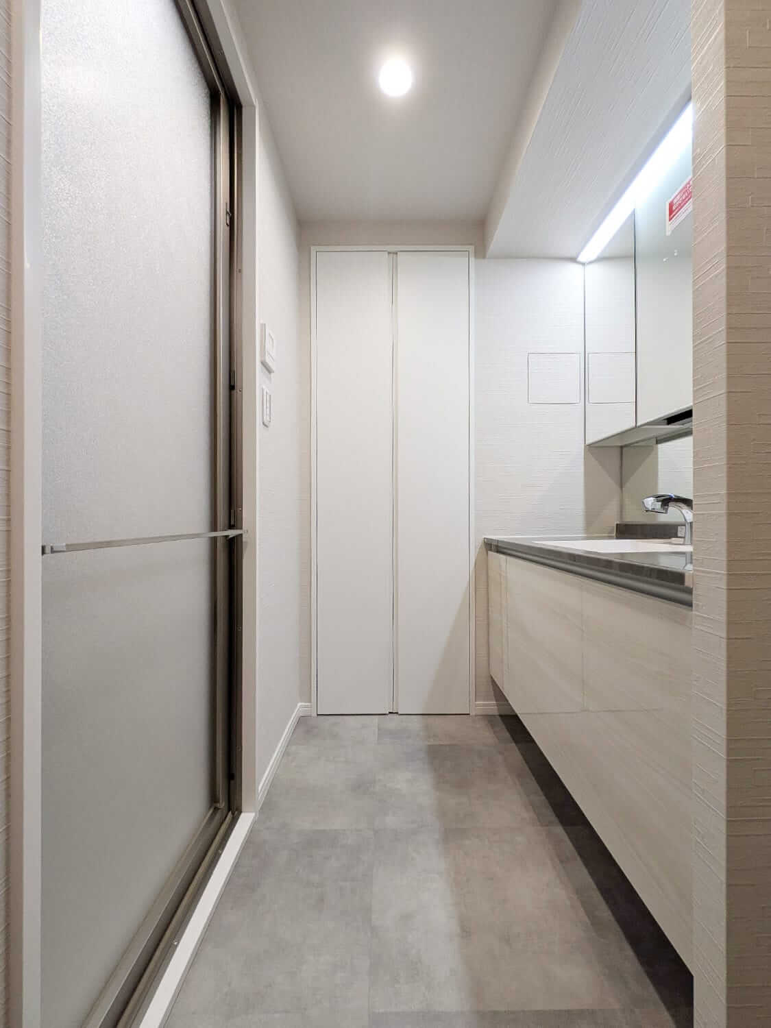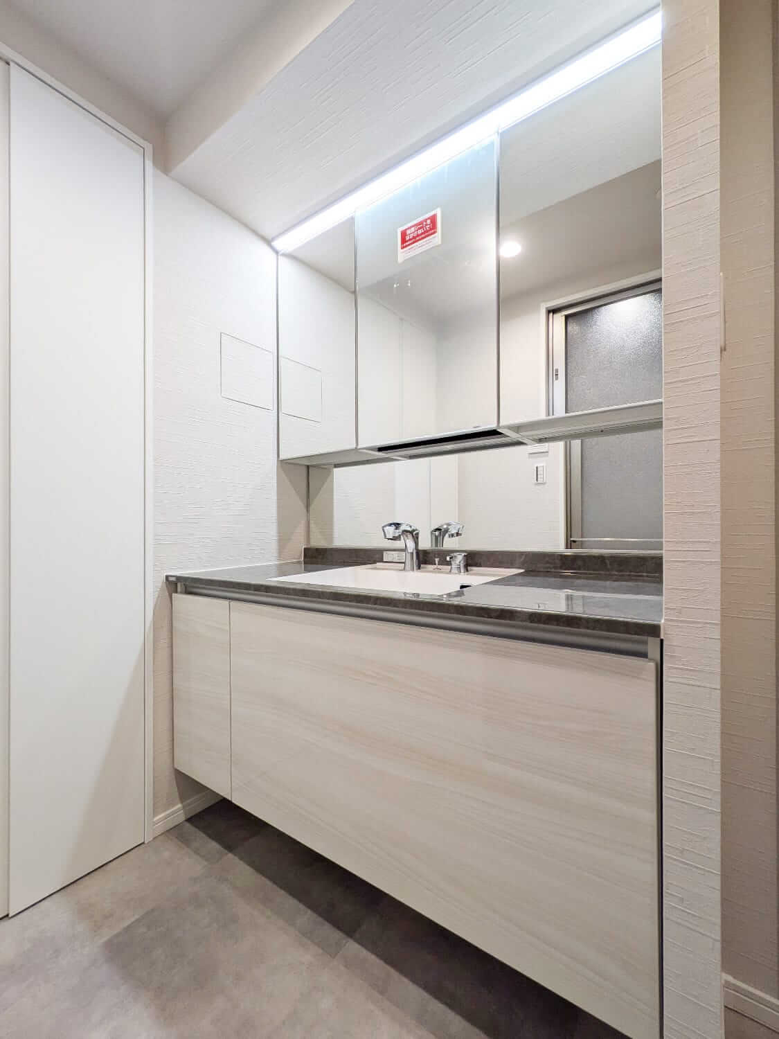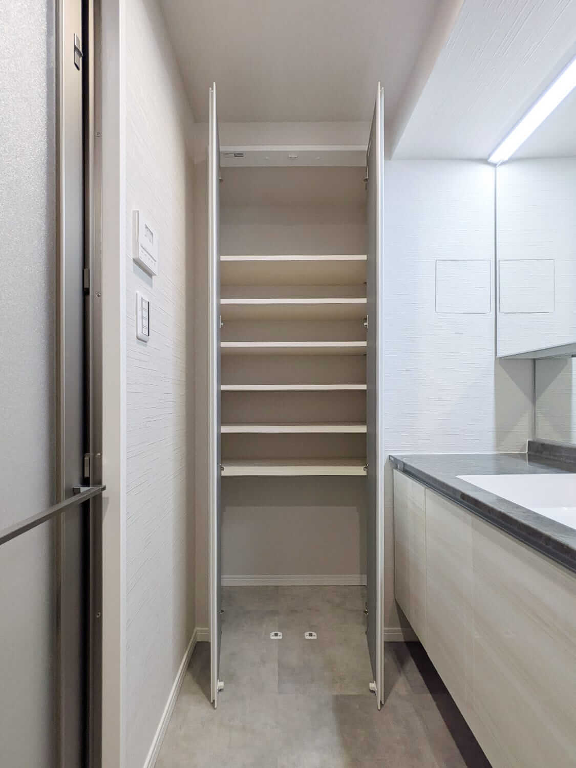 洗面化粧台は洗面まわりの小物がすっきり整頓できるミラーボックスや、モノの出し入れがしやすい引き出し式のキャビネット付きで使い勝手の良さもポイントです。リネン庫付きで収納スペースも充実しています。