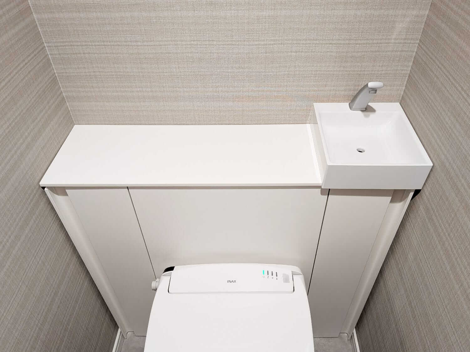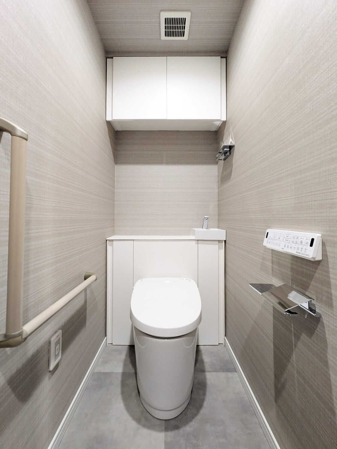 廊下に面したレストルーム。タンクレスのようなデザインですっきりとした印象です。ウォシュレット、収納スペースも備わっています。