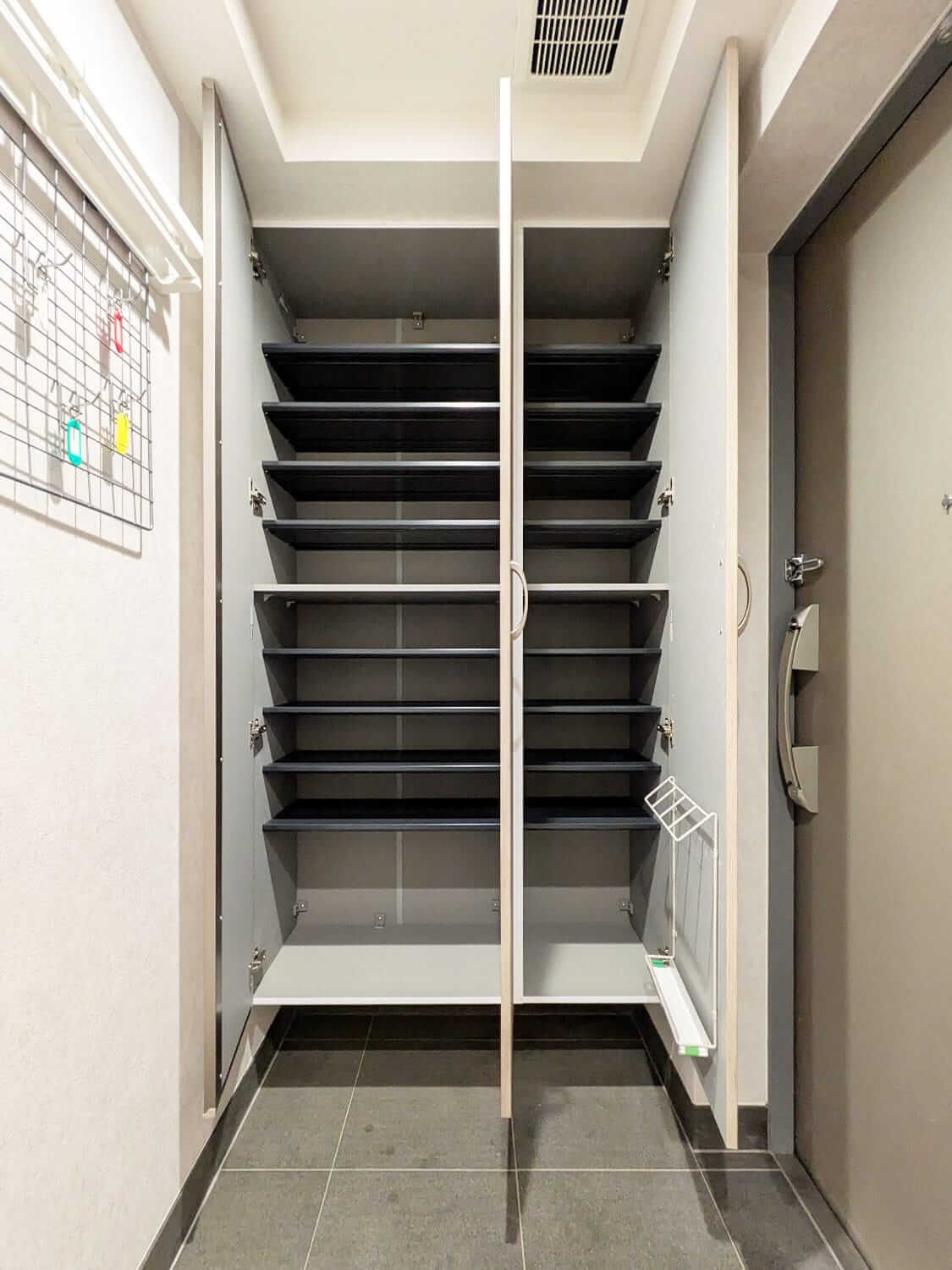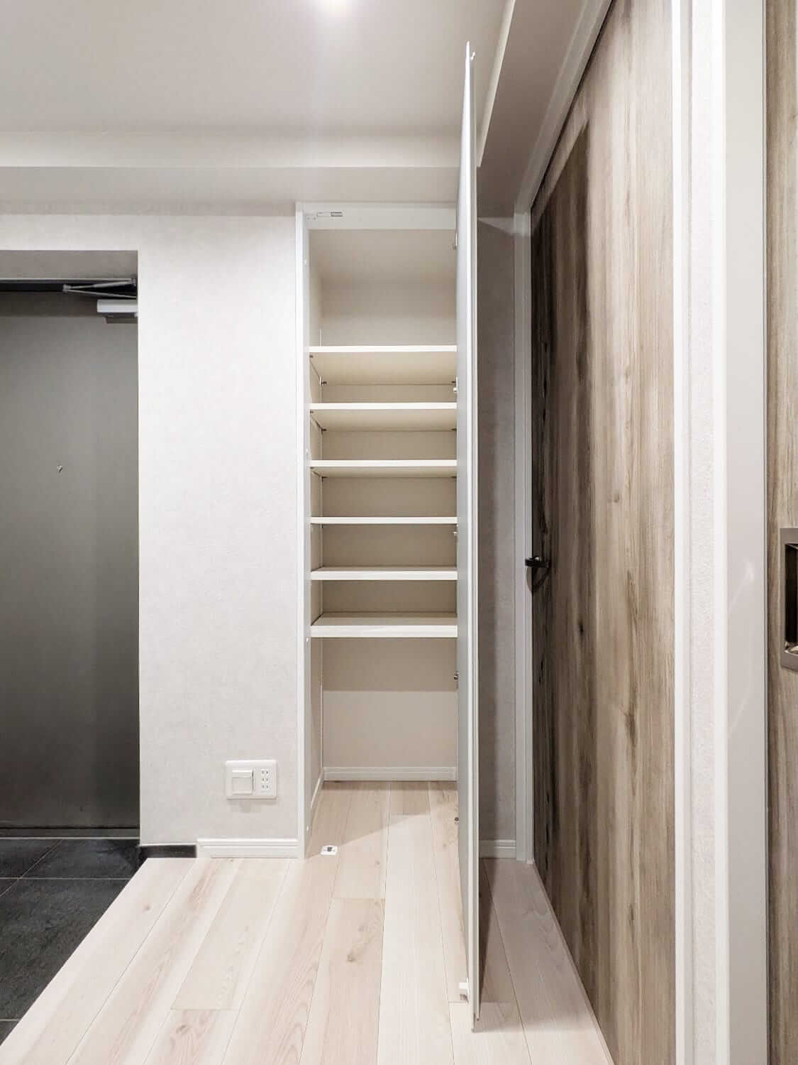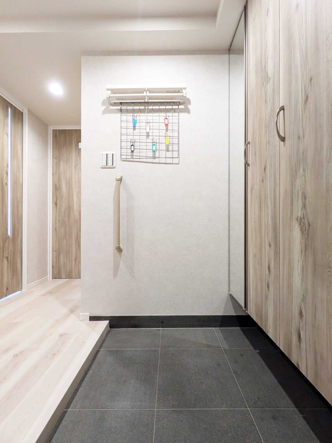 玄関には天井まで高さのあるシューズボックスを完備。扉の一面が姿見になっていて、お出かけ前の身だしなみチェックに便利です。廊下にも収納スペースが備わっています。