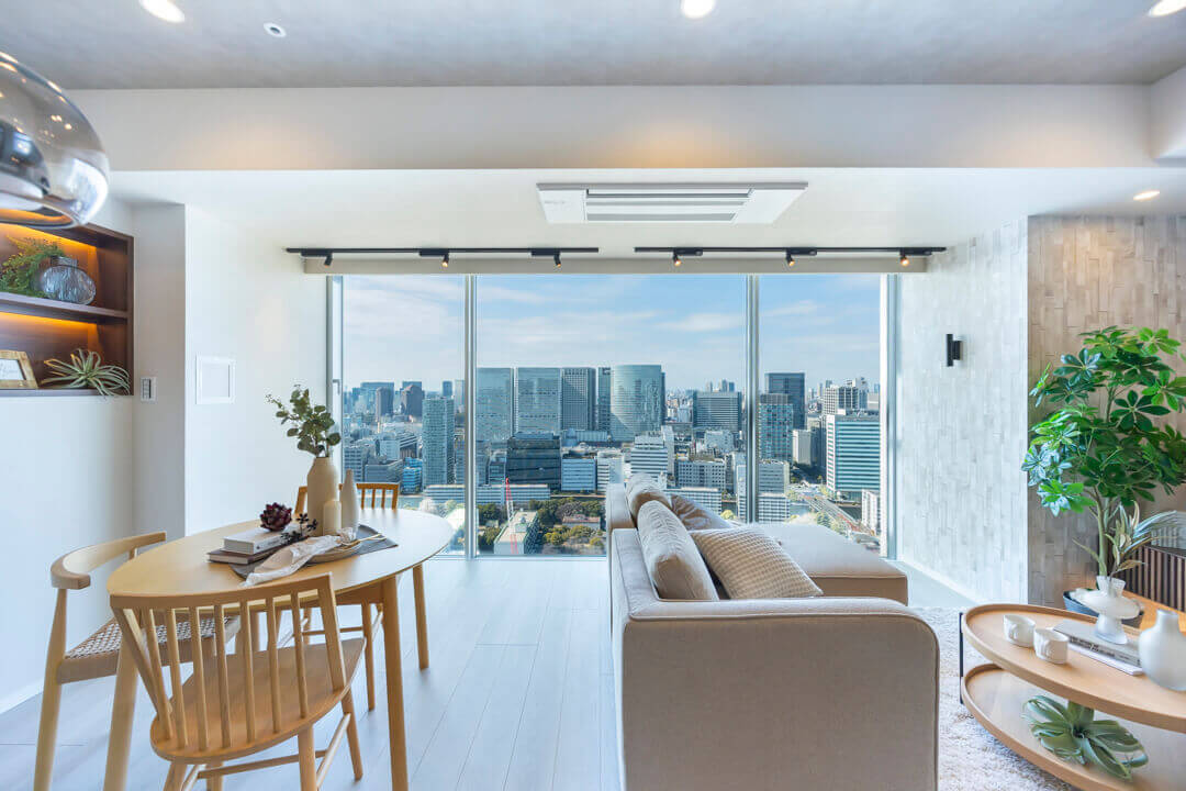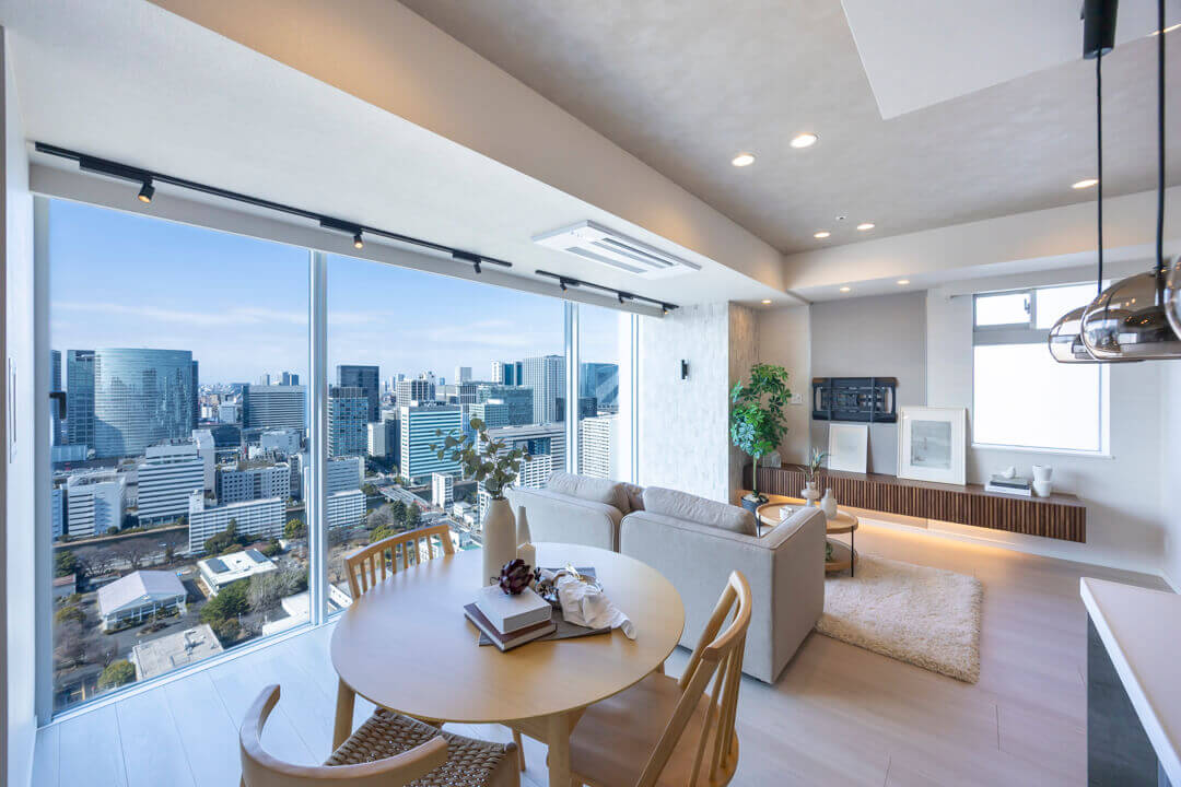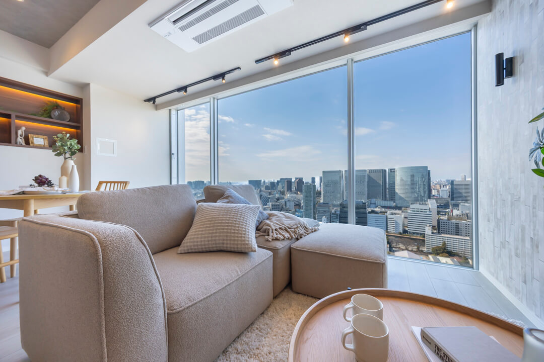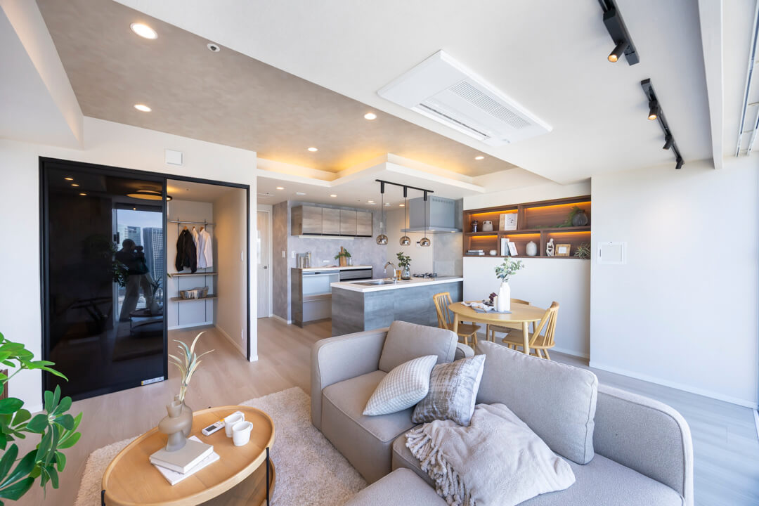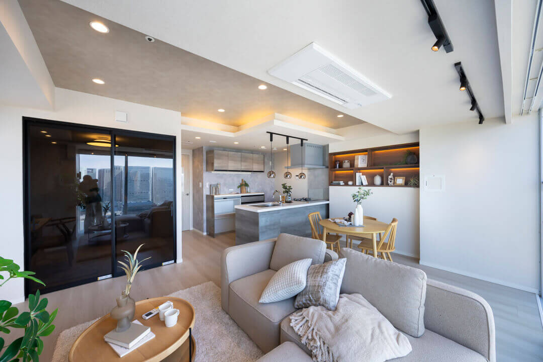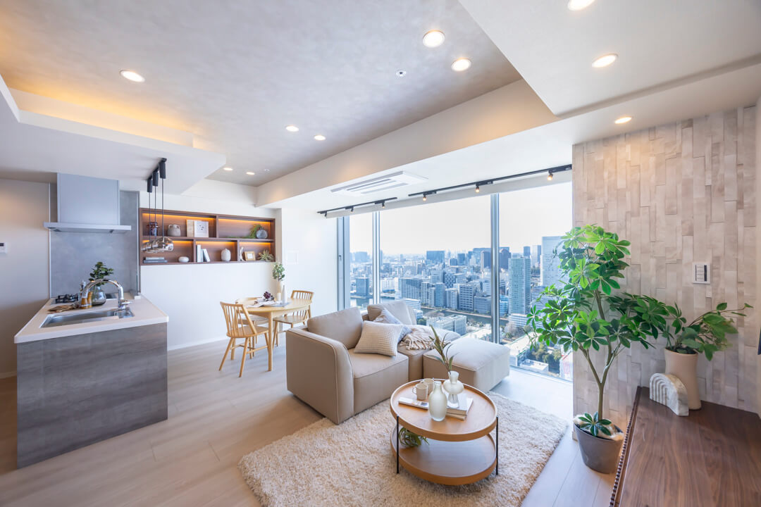 キッチンスペースを含め、約17.2帖のLDK。家族でゆったり過ごせる広さです。西側には開放感あふれる大きな窓が広がっており、品川エリアのビル群が望めます。夜には煌びやかな夜景も楽しめそうですね。天井には間接照明が施されていて、空間をやさしい光で照らしてくれます。