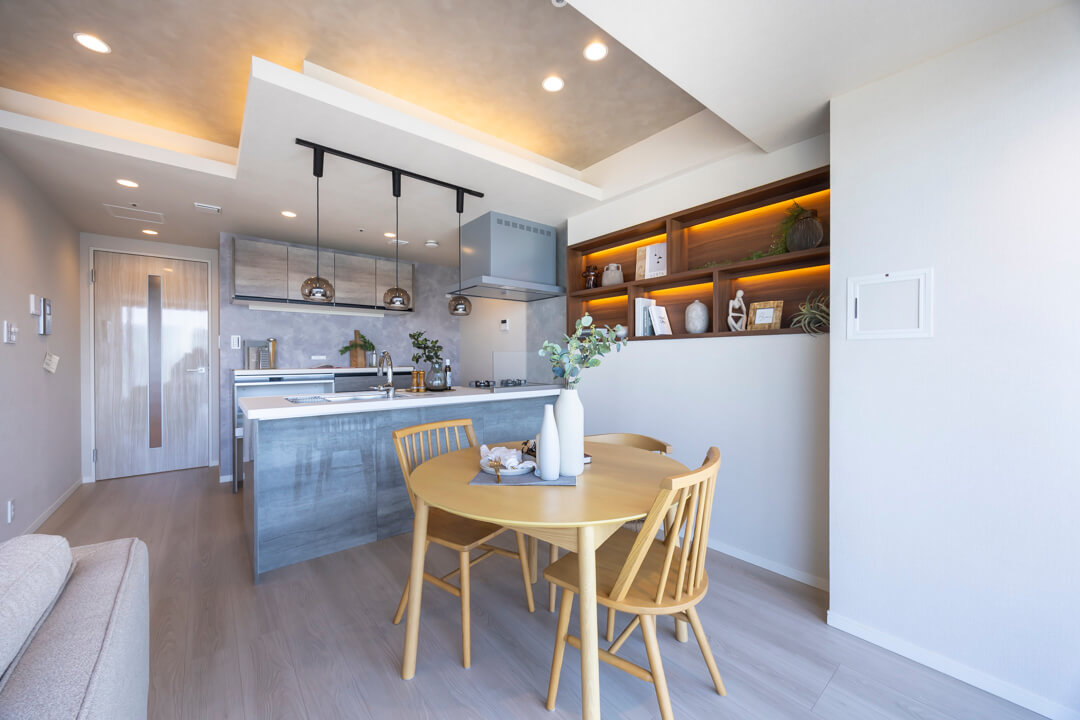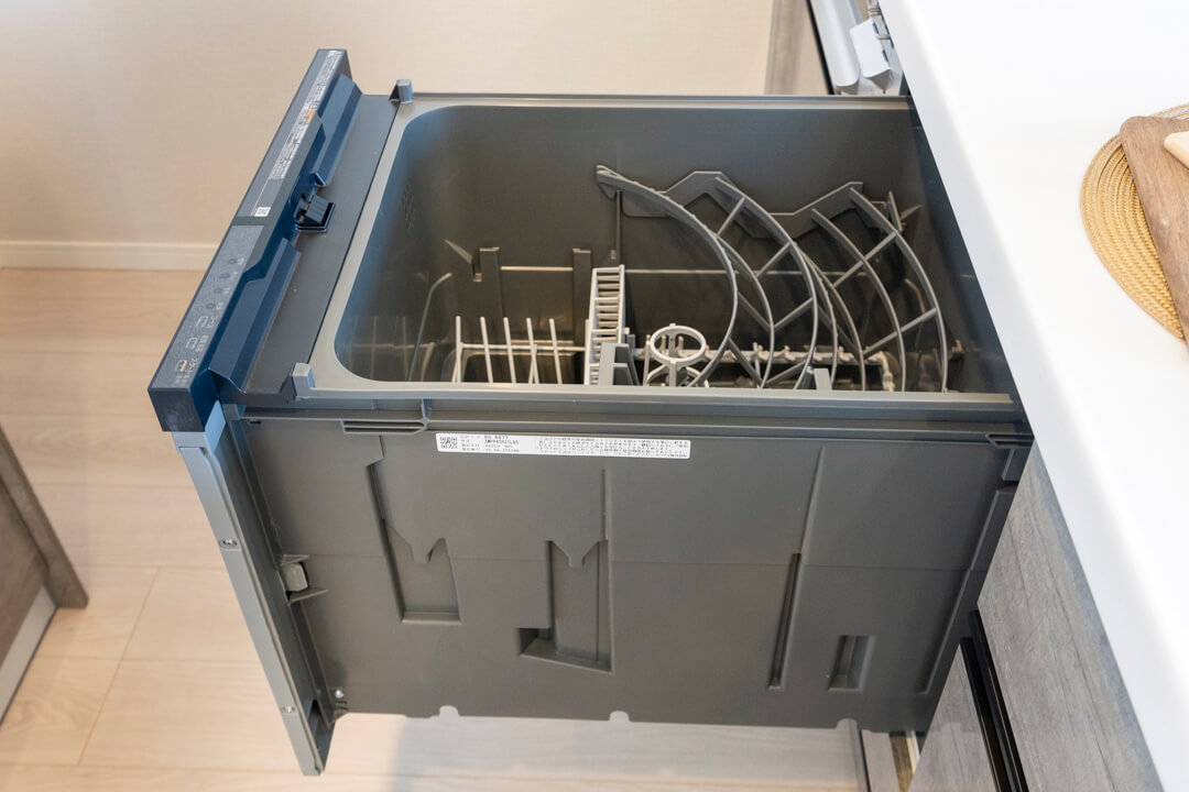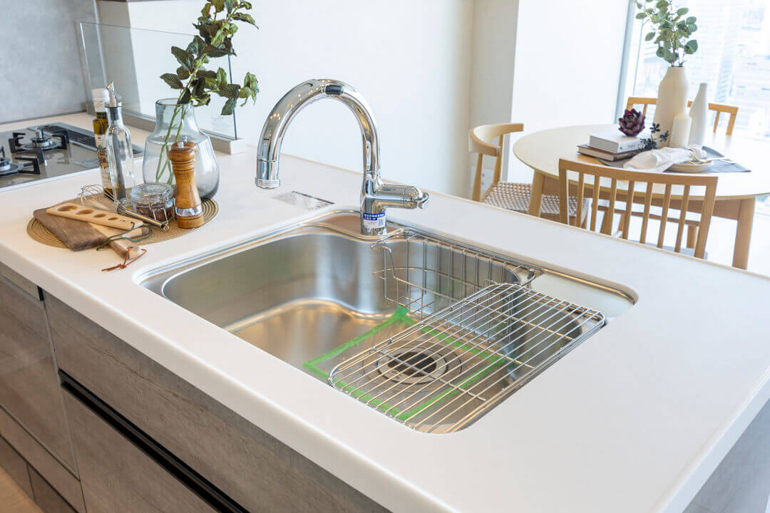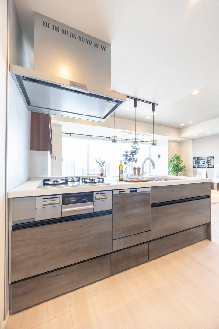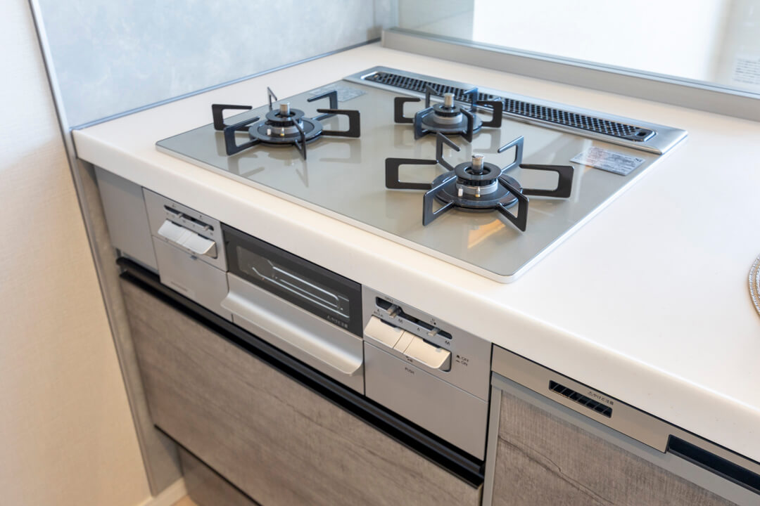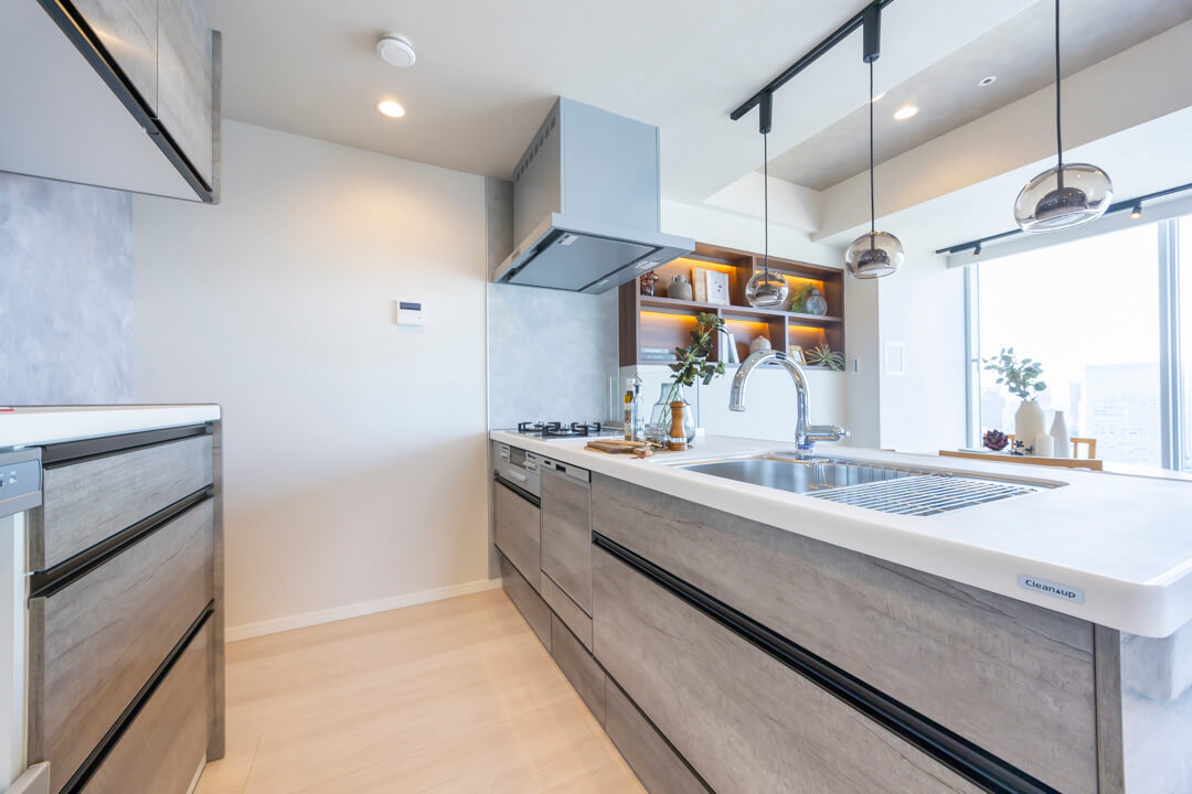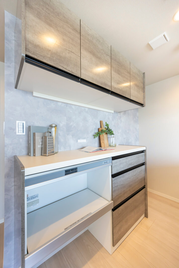 リビングダイニングが見渡せる開放的なオープンキッチン。家族やゲストと会話がしやすく、小さなお子さんがいるご家庭では子どもの姿も見守れます。料理が捗る3口ガスコンロ、家事の時短に心強い食洗機、生ゴミの処理に便利なディスポーザー付きで設備も充実。カップボードも設置されていて、収納スペースもしっかりと確保されています。