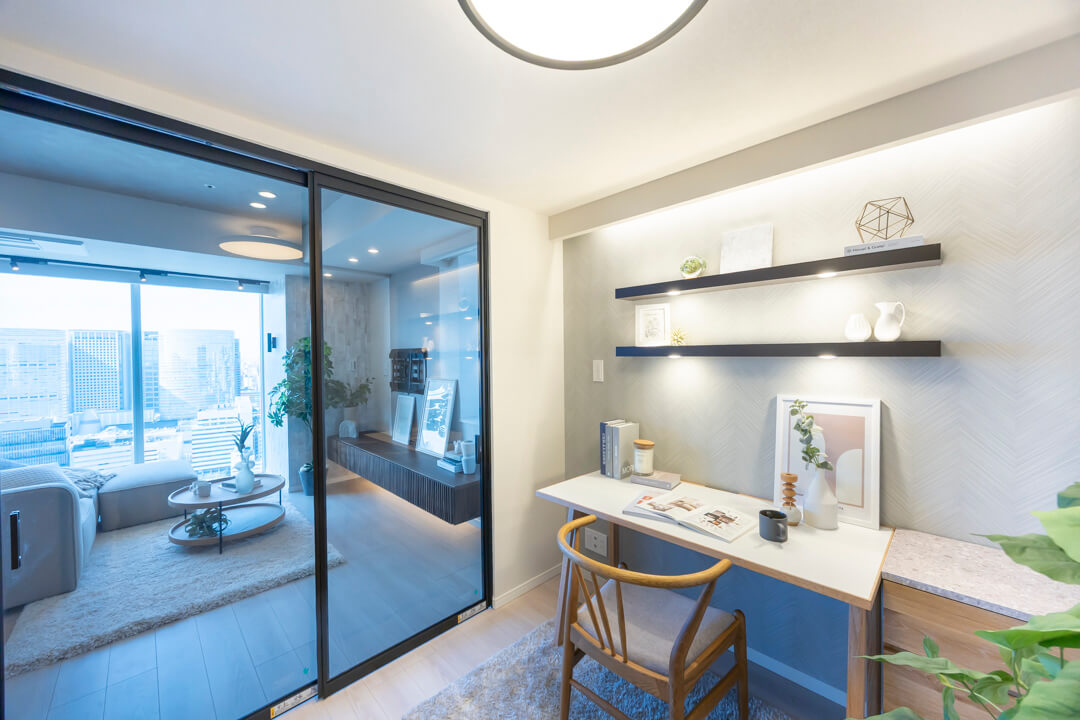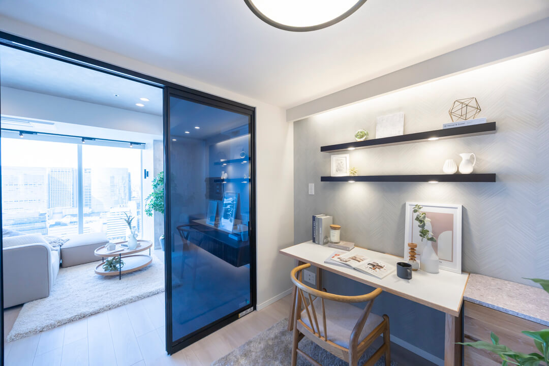 リビングダイニングと隣接した約3.4帖のサービスルーム。引き戸が半透明になっていて、ワークスペースや趣味部屋としても使いやすいお部屋です。オープンクローゼットも付いています。