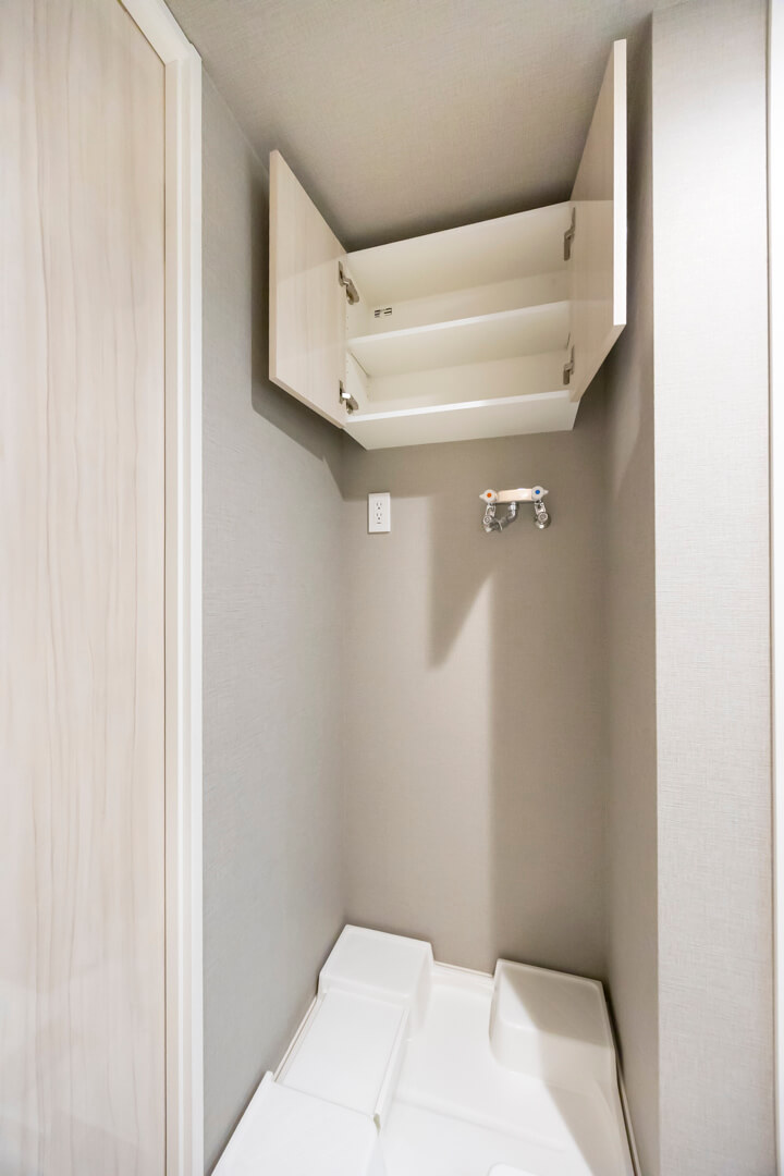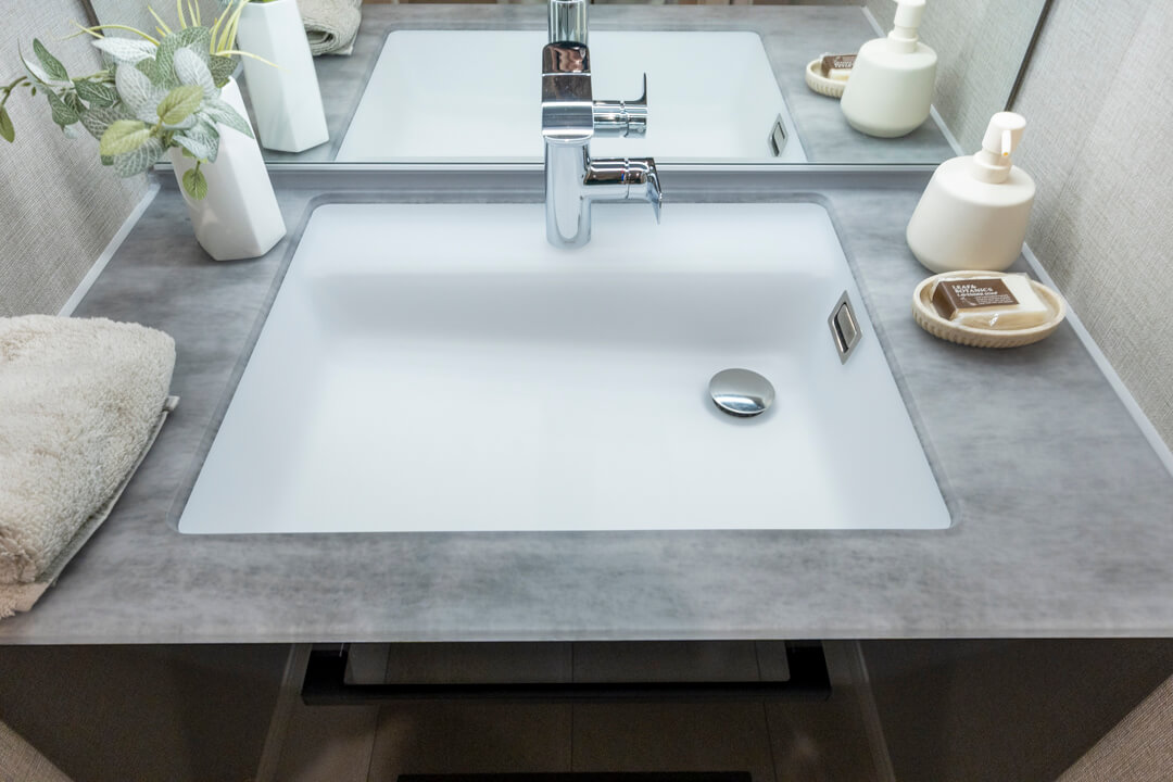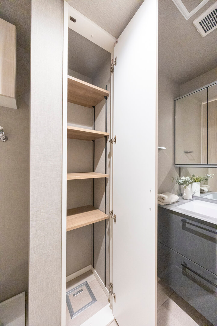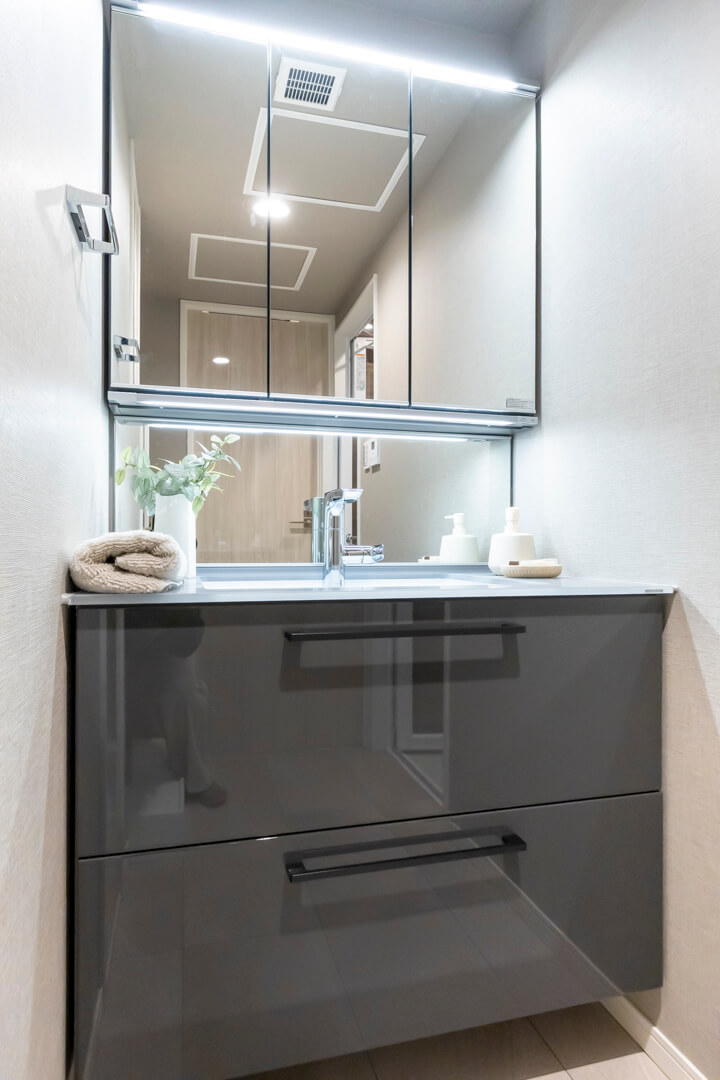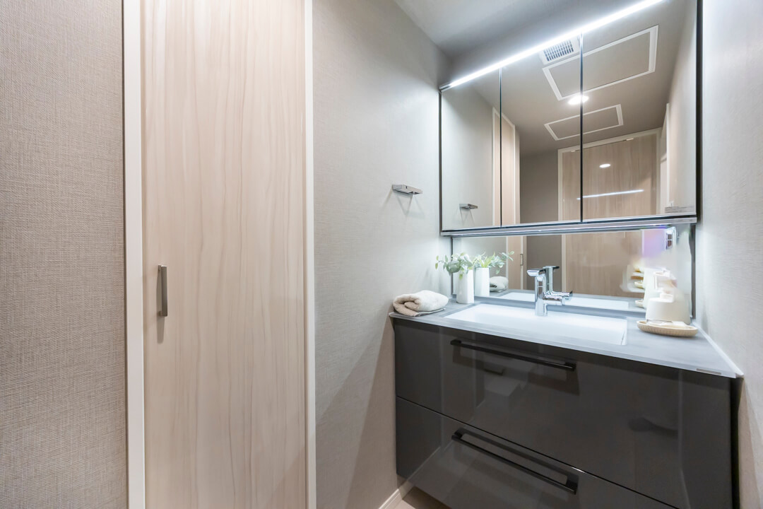 洗面化粧台は、洗面まわりの小物がすっきり整頓できるミラーボックスや、モノの出し入れがしやすい引き出し式のキャビネット付きで使い勝手の良さもポイント。リネン庫も付いていて、収納スペースもしっかりと確保されています。