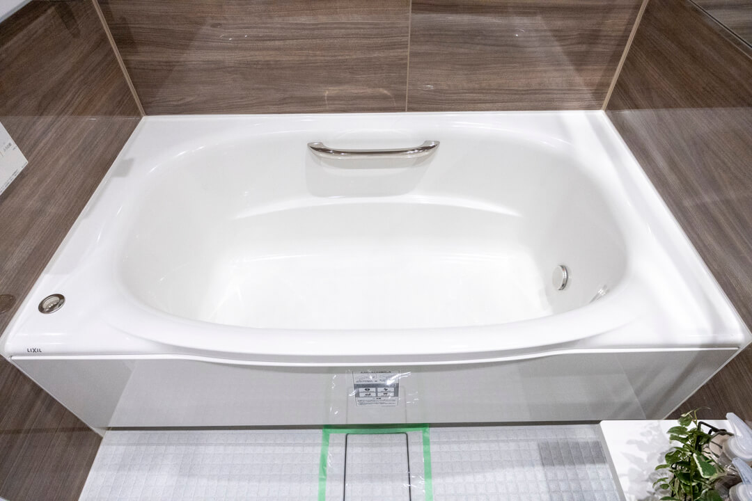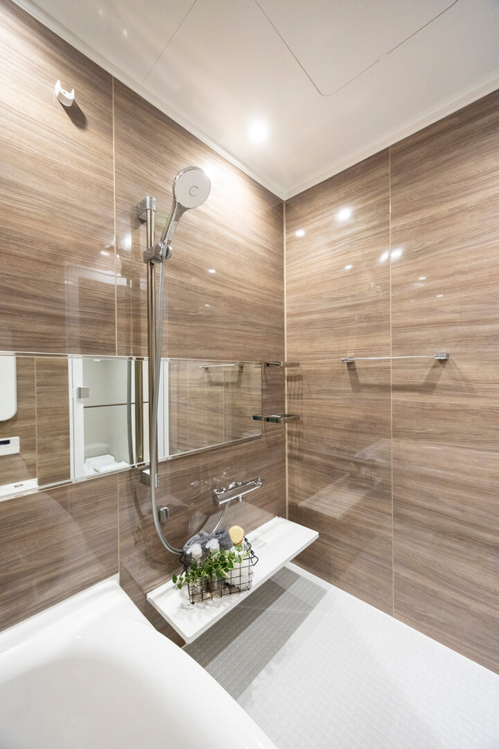 1418サイズのバスルーム。ウッド調であたたかみのある雰囲気です。追い炊き機能の他、乾燥・換気・暖房・涼風の4つの機能が備わっていて、一年中快適にバスタイムが楽しめます。ランドリーパイプも2本備わっていて、雨の日や冬場の洗濯にも困りません。