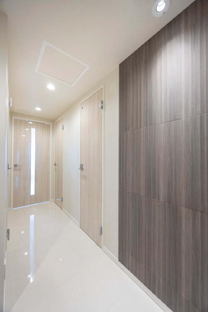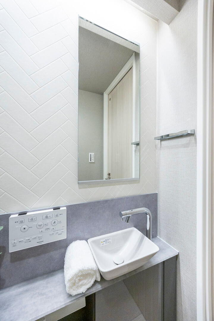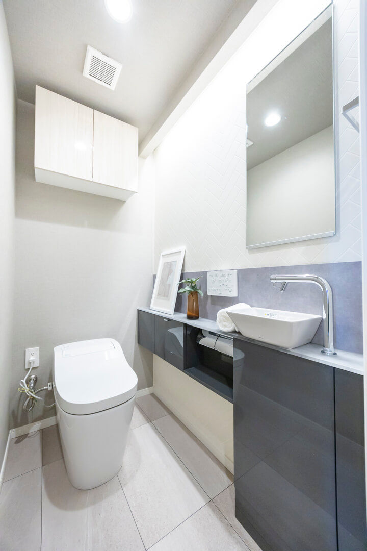 廊下に面したレストルーム。空間がすっきり見えるタンクレストイレです。手洗いカウンター、ウォシュレット、2ロールのペーパーホルダー、収納スペースが備わっています。