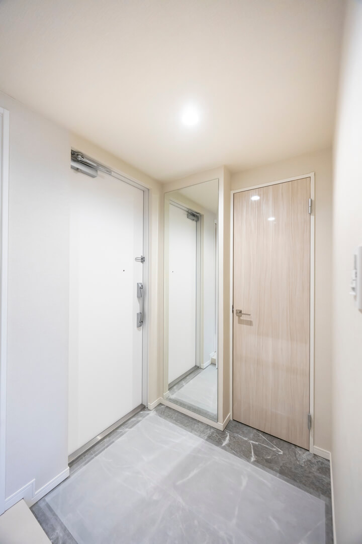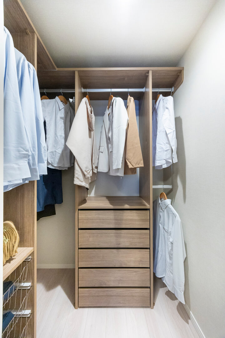 玄関にはSIC(シューズインクローゼット)が備わっていて、靴はもちろん、ベビーカーやスポーツ用品も収納できそうです。姿見も付いていて、お出かけ前の身だしなみチェックもできます。廊下にはマルチWIC(ウォークインクローゼット)が設けられていて、季節物の洋服や家電なども整頓できます。