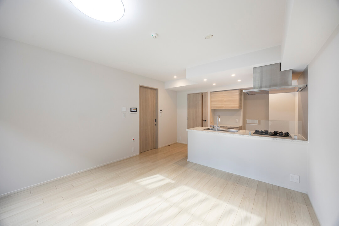 キッチンスペースを含め、約14.6帖のLDK。南東向きで1階部でありながら、陽の光が入る明るい空間です。床暖房が設置されていて、冬場でも足元からじんわりと温まれます。床に直接座ったり、寝転んでもひんやり感なく暖かく過ごせます。