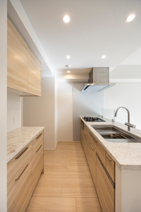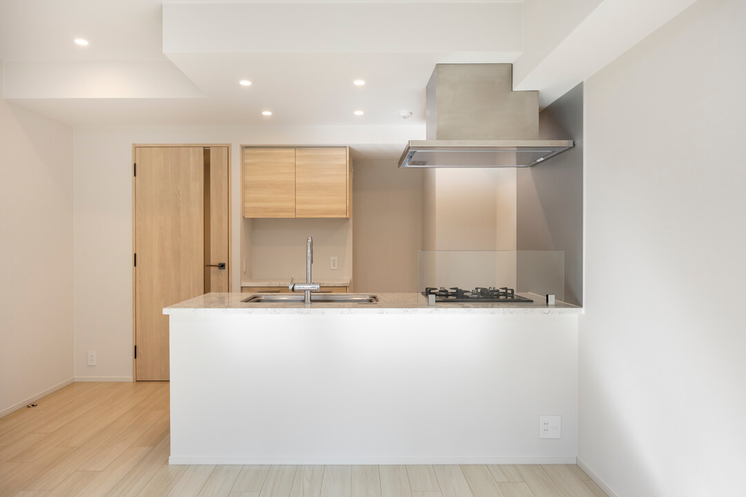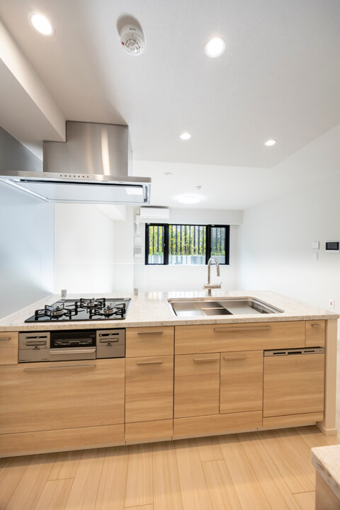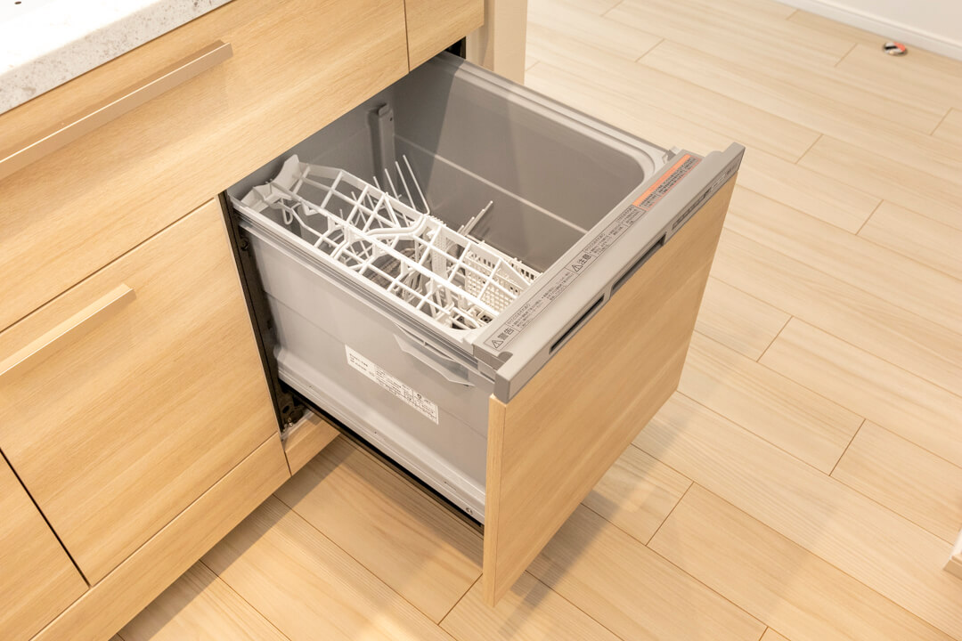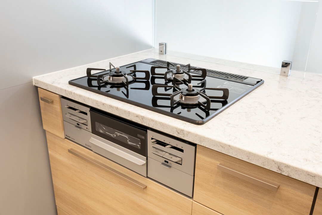 リビングダイニングが見渡せる開放的なオープンキッチン。家族やゲストとのコミュニケーションが取りやすく、小さなお子さんがいるご家庭では子どもの姿も見守れます。料理が捗る3口ガスコンロ、家事の時短に心強い食洗機。カップボードも設置されていて、収納スペースもしっかりと確保されています。
