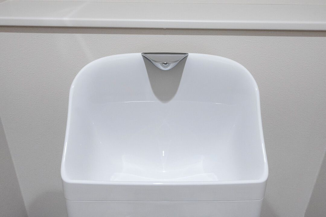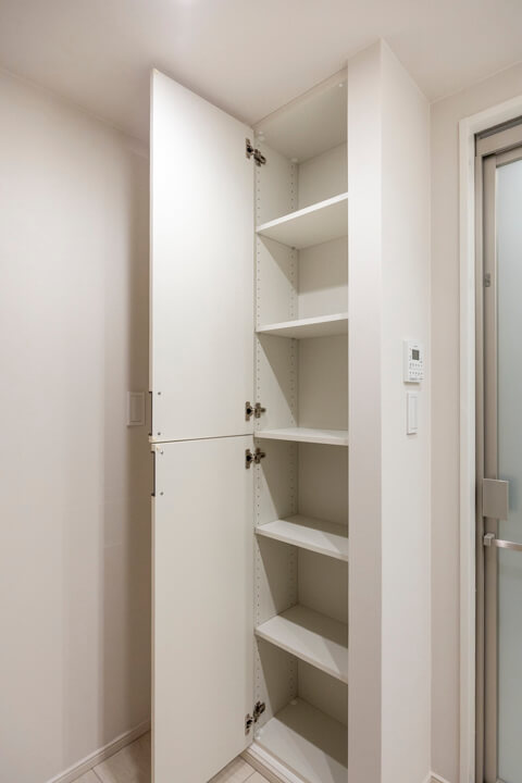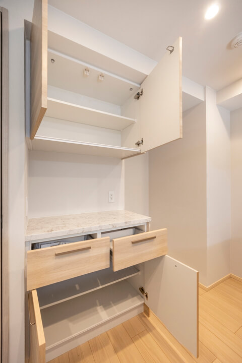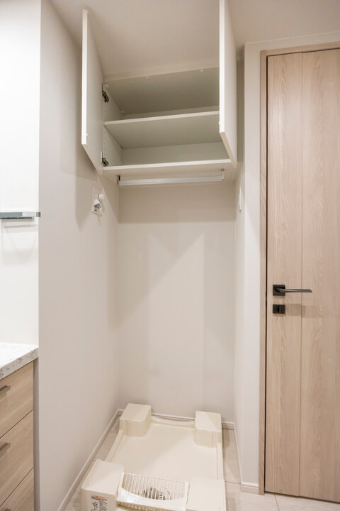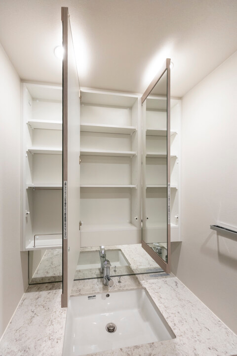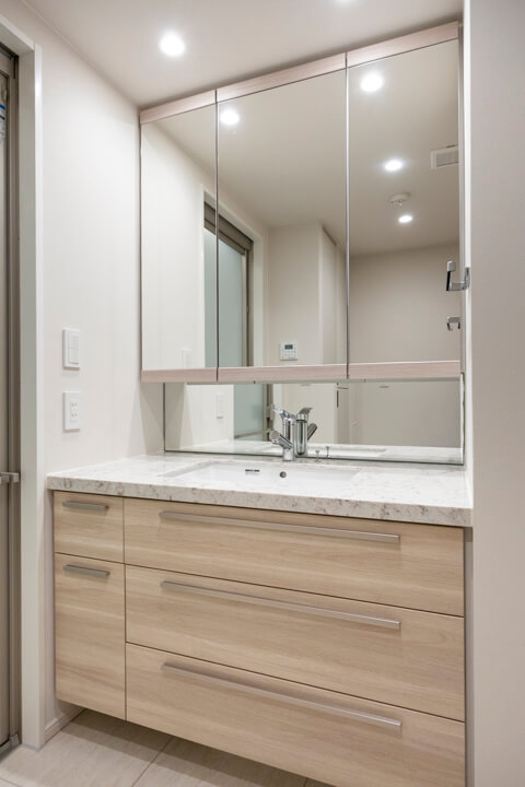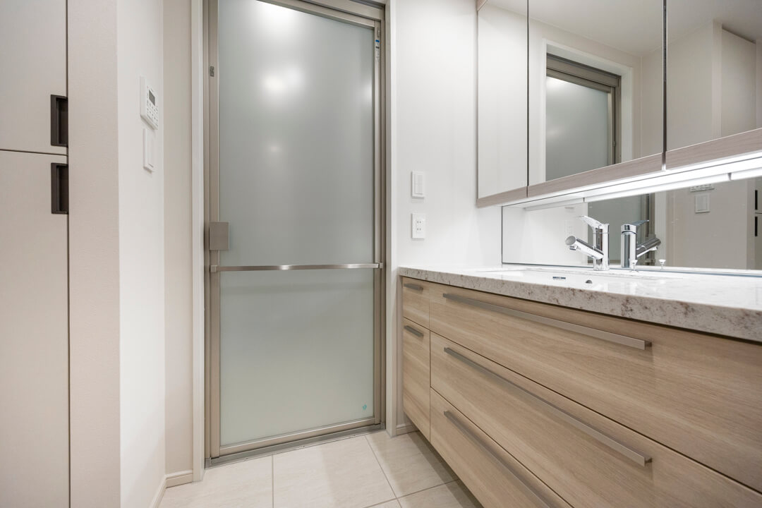 洗面化粧台は洗面まわりの小物がすっきり整頓できるミラーボックスや、モノの出し入れがしやすい引き出し式のキャビネット付きで使い勝手の良さもポイント。リネン庫も備わっています。