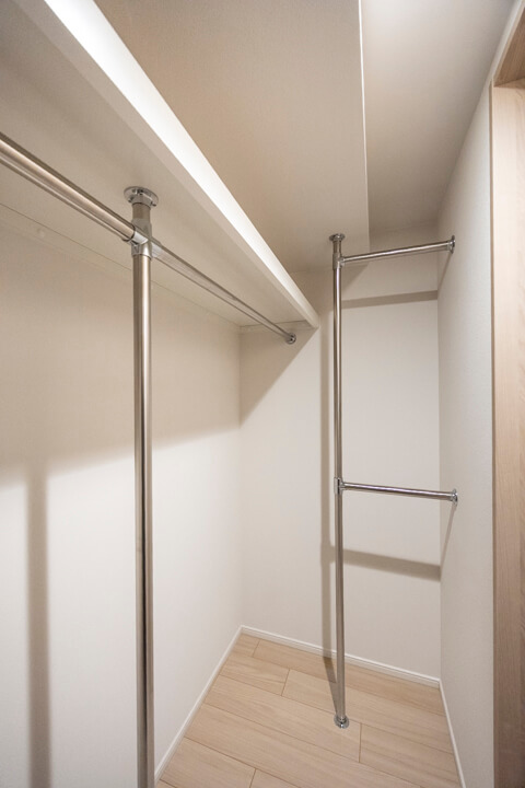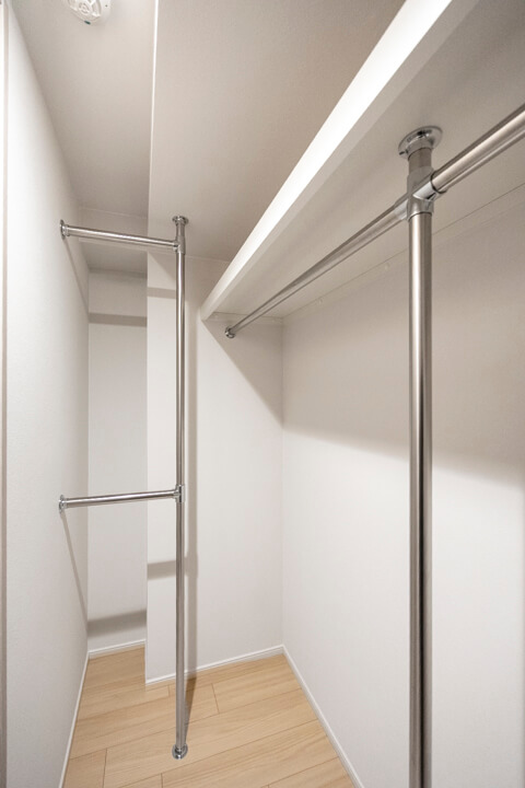 約6.0帖の洋室。こちらも南東向きで、自然な光が入ります。バルコニーへの出入りも可能。WIC(ウォークインクローゼット)は3方向にハンガーパイプが付いていて、洋服がたくさん掛けられます。