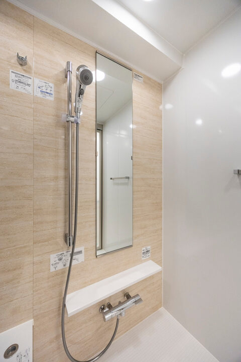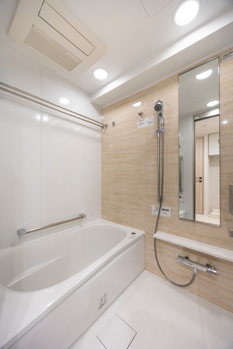 ウッド調のアクセントパネルであたたかみのある雰囲気のバスルーム。追い炊き機能の他、乾燥・換気・暖房・涼風の4つの機能が備わっていて、一年中快適にバスタイムが楽しめます。ランドリーパイプも2本備わっていて、雨の日や冬場の洗濯にも困りません。