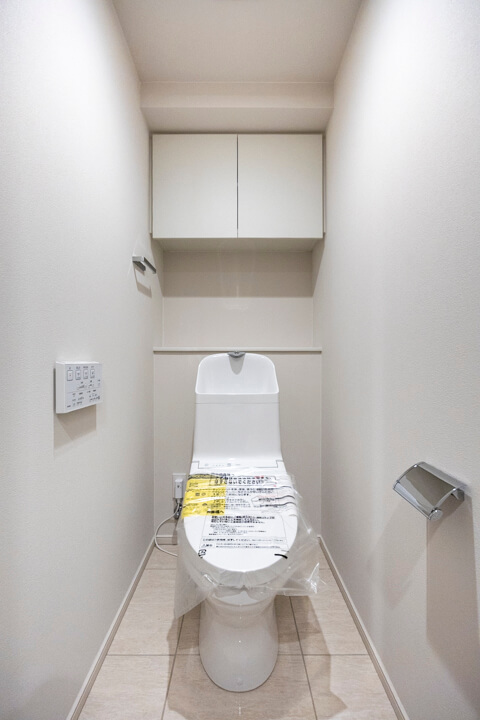 廊下に面したレストルーム。手洗いタンク付きのトイレです。ウォシュレット、収納スペースも備わっています。