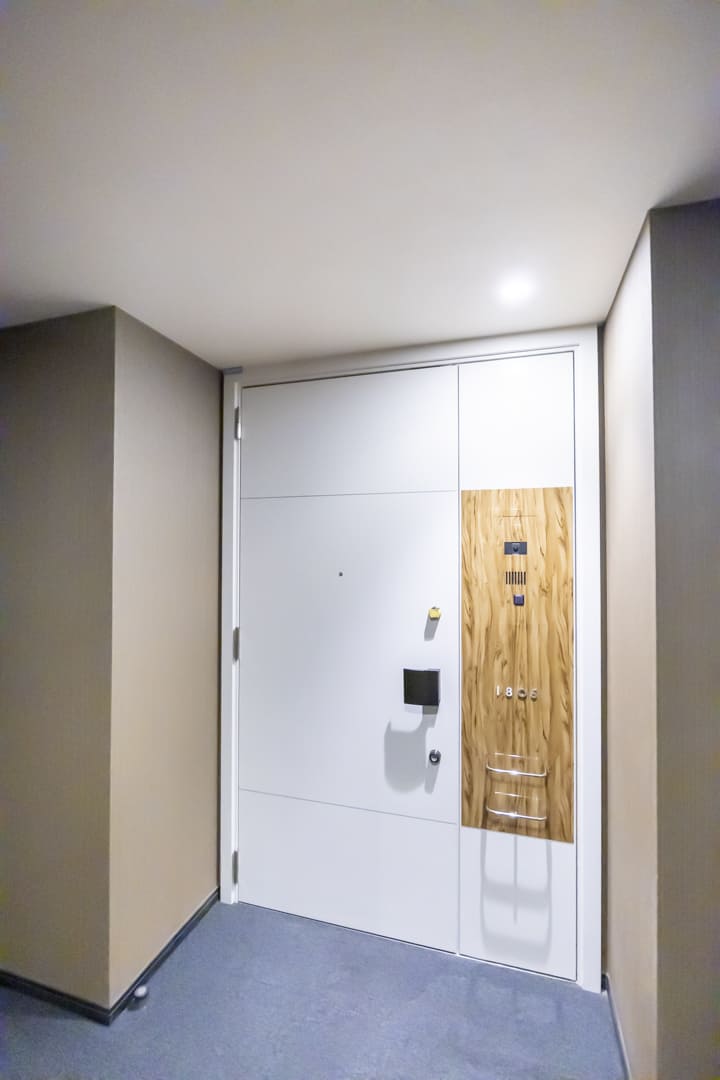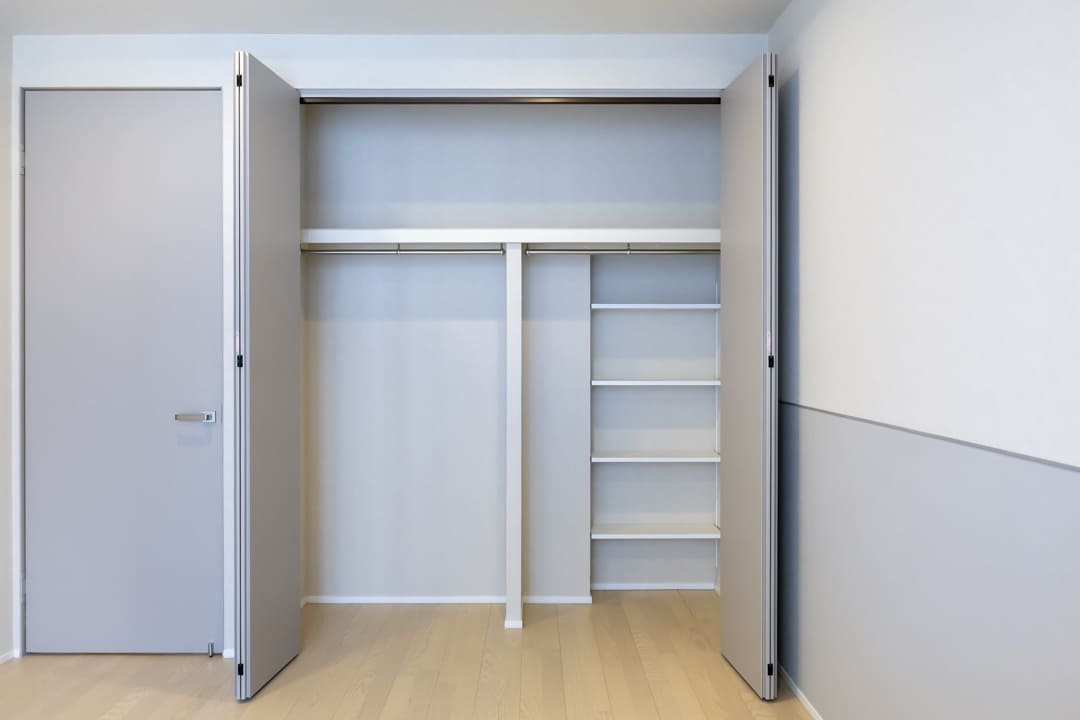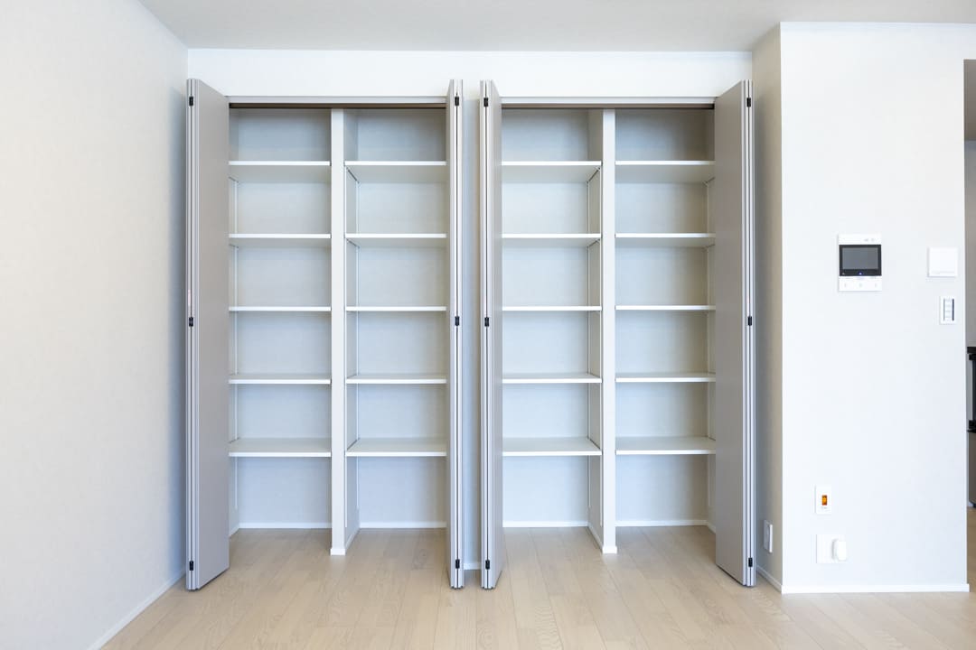 折れ戸タイプの収納を2ヶ所に設け、充分な収納力を確保。内部は可動棚仕様となっていて、生活用品や書類、インテリア小物まで効率よく整理できます。空間に生活感を出さない“見せない収納”により、洗練された室内をすっきりと美しく保てるのも魅力です。