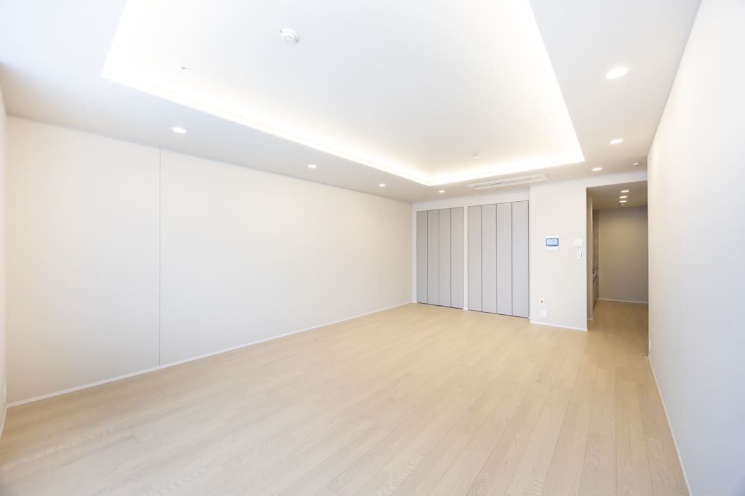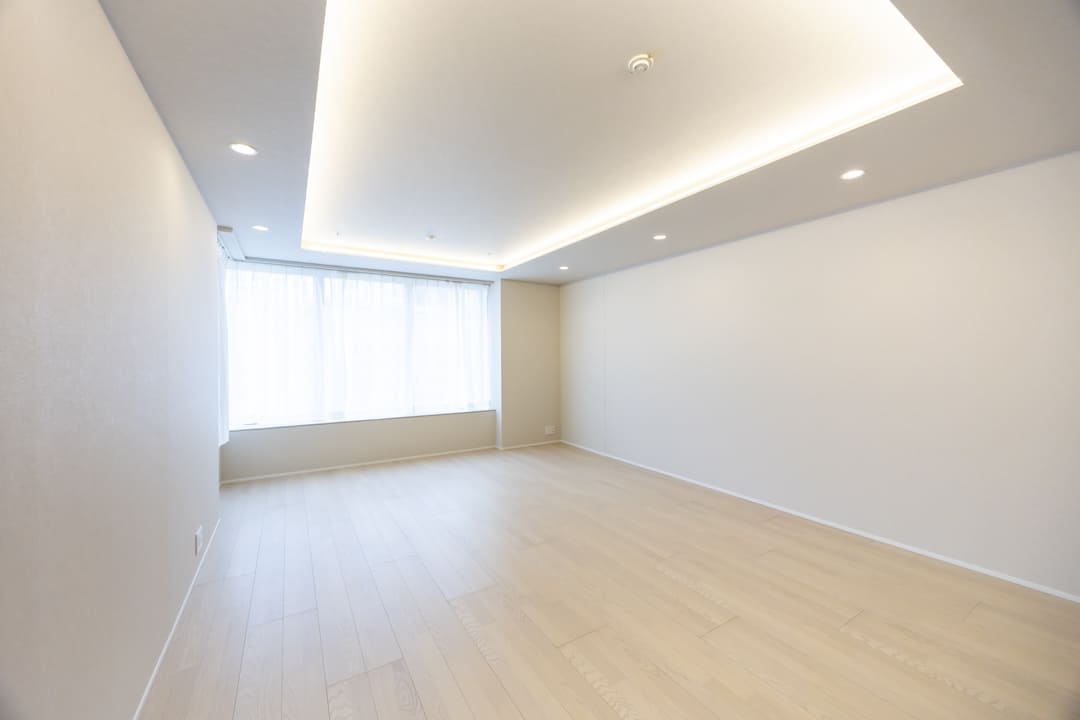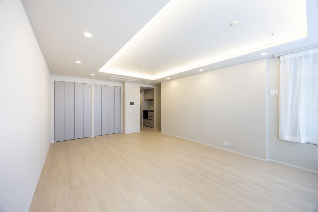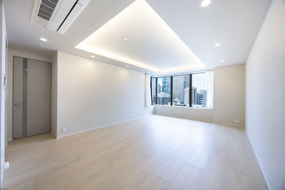 約21.5帖のゆとりあるLDK。北西向きの大きな窓からは都心の景色が広がり、時間とともに移ろう街の表情を日常の一部としてお愉しみいただけます。折り上げ天井には間接照明を施し、やわらかな光が空間に奥行きをもたらす設計。明るい木目柄のフローリングが全体をやさしく包み込み、モダンからナチュラルまで幅広いインテリアと調和する、洗練された上質な住空間です。