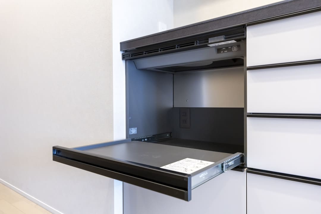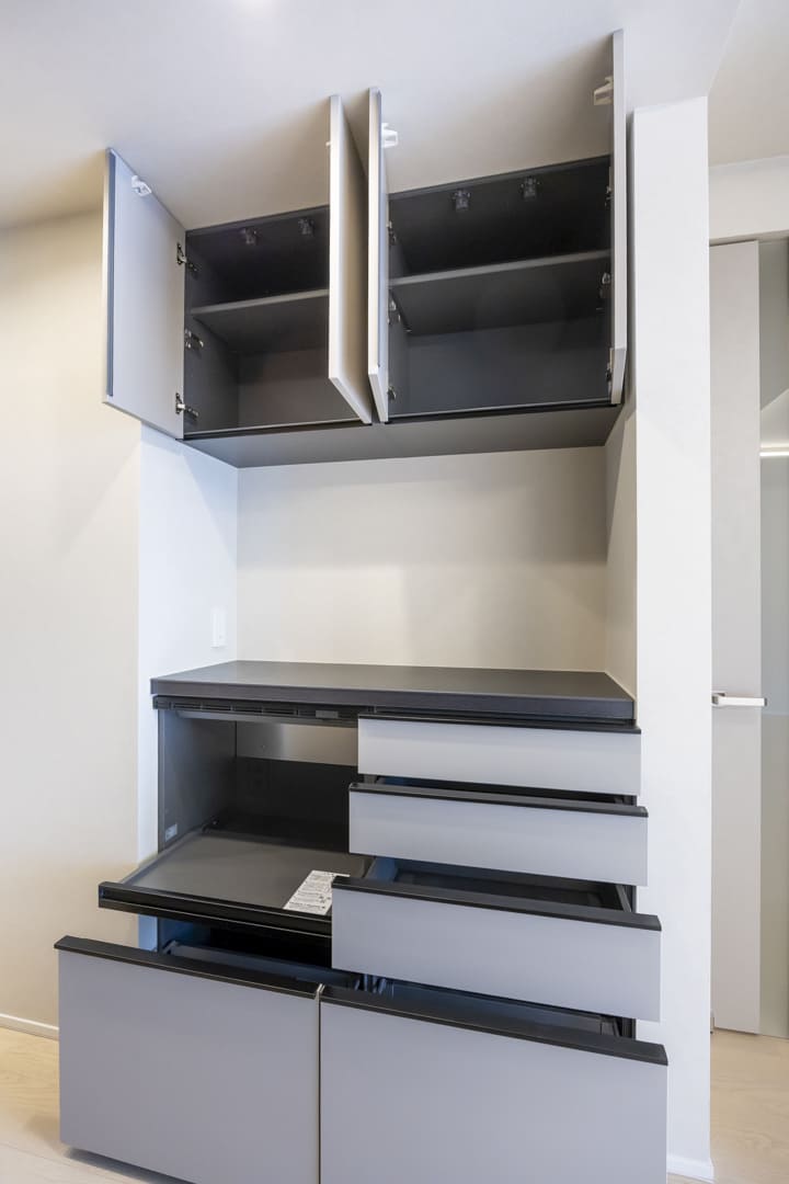 背面には収納力のあるカップボードを完備。キッチンと同じデザインで統一感があります。食料品のストックや食器類を整頓でき、散らかりがちなキッチンまわりがすっきり片付きそうです。さらに、トレーボードは引き出し可能。自動で蒸気を排出する機能が付いているので、収納したままご飯を炊いたり、お湯を沸かすことができて便利です。