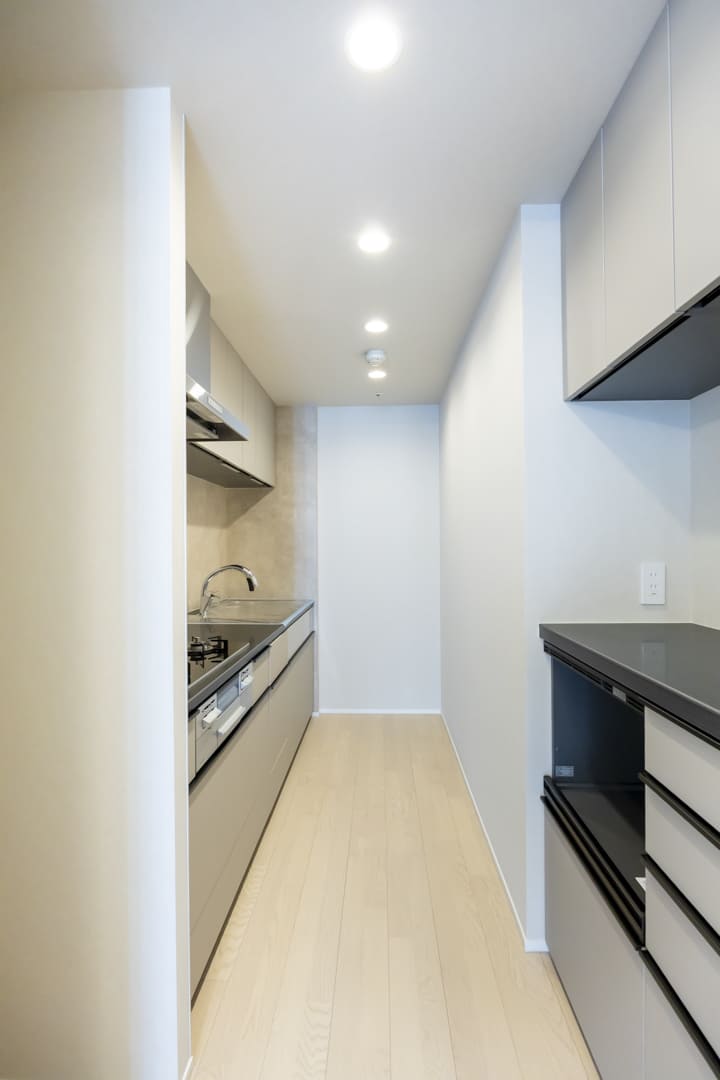 生活空間から程よく切り離された独立型キッチンは、落ち着いて調理に集中できる上質な設計。ブラックのカウンターが重厚感を添え、空間全体に洗練された印象をもたらします。キッチンまわりの生活感をさりげなく抑えられるほか、調理中のにおいがリビングへ広がりにくい点も魅力です。