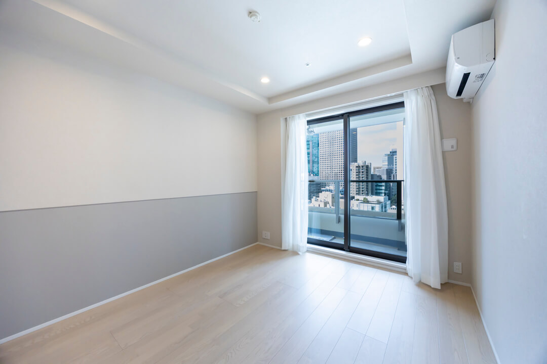 約7.0帖の洋室1は、主寝室にぴったり。北西向きのバルコニーに面し、窓先へと視線が抜けることで、のびやかな印象をもたらします。グレーの腰壁がさりげないアクセントとなり、落ち着きある雰囲気を演出。大容量のクローゼットにはハンガーパイプと可動棚を備え、衣類はもちろん、小物類も美しく整頓できる設計です。