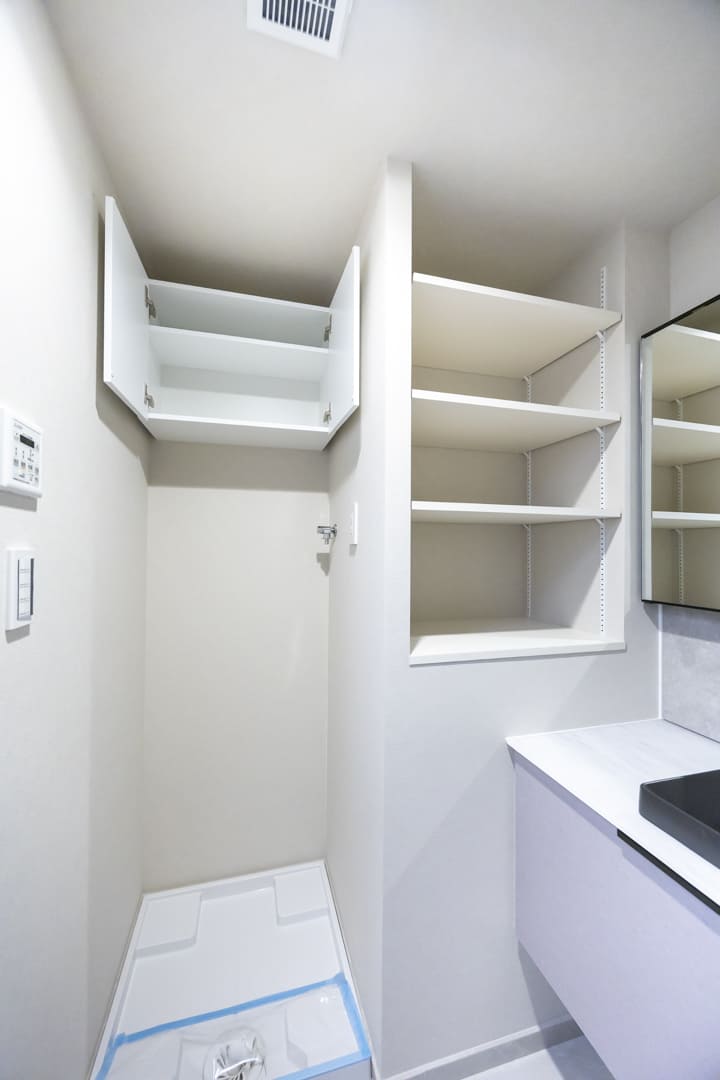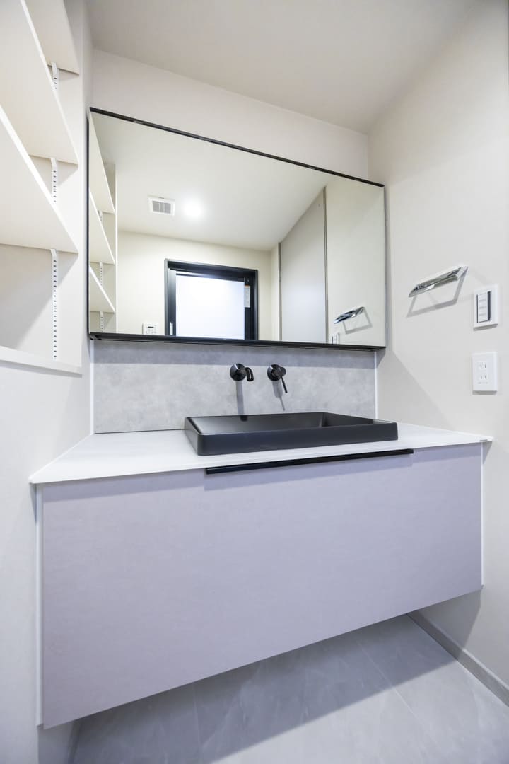 ブラックの洗面ボウルがアクセントとなり、スタイリッシュな洗面化粧台。カウンタースペースにゆとりがあり、化粧品やドライヤーの仮置きが可能です。忙しい朝の身支度も落ち着いて行えそうですね。左手には可動棚を設け、タオルやスキンケア用品など、日常使いのアイテムをすっきりと収納できます。