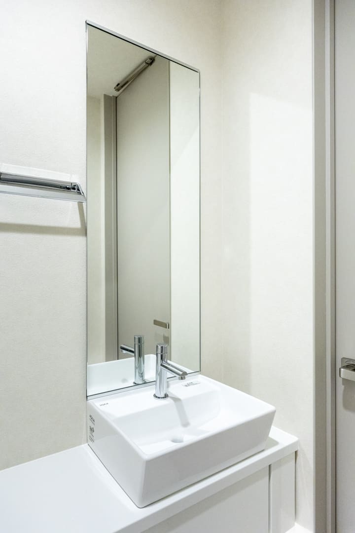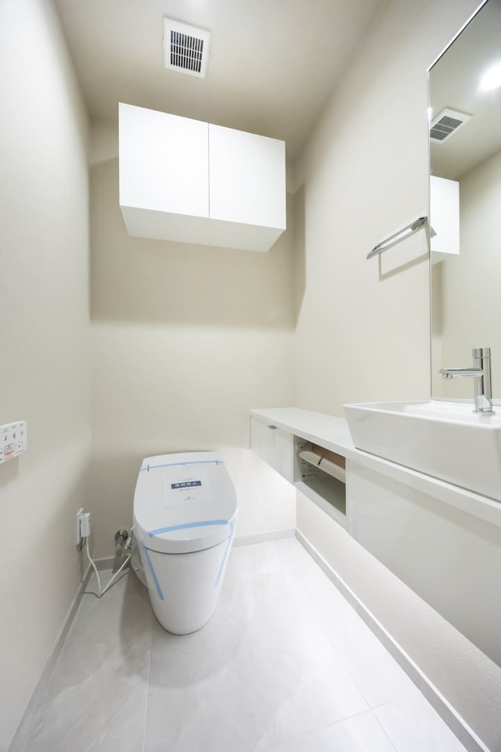 廊下に面していて独立性の高いレストルーム。すっきりとした見た目のタンクレストイレに交換済みです。手洗いカウンター付きのため、使用後すぐに手を洗うことができ、衛生面にも配慮された設計。ゲストを洗面室まで案内する必要がなく、スマートにお使いいただけるのも嬉しいポイントです。