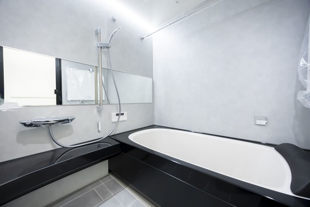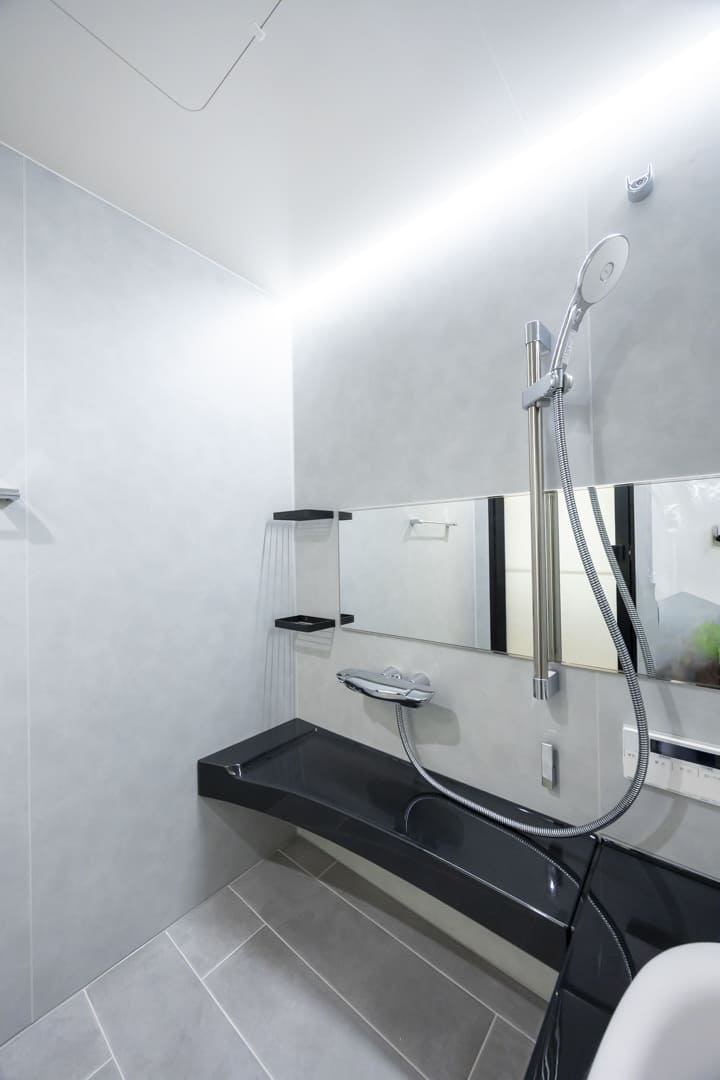 ブラックとグレーを基調とした、洗練されたバスルーム。LIXILの上位シリーズ「スパージュ」を採用し、上質なリラクゼーション空間を演出しています。換気・暖房・乾燥・涼風機能を備え、季節を問わず快適なバスタイムを実現。追い焚き機能も備わり、家族の入浴時間が異なる日や、ゆったりと半身浴を楽しみたい時にも重宝します。